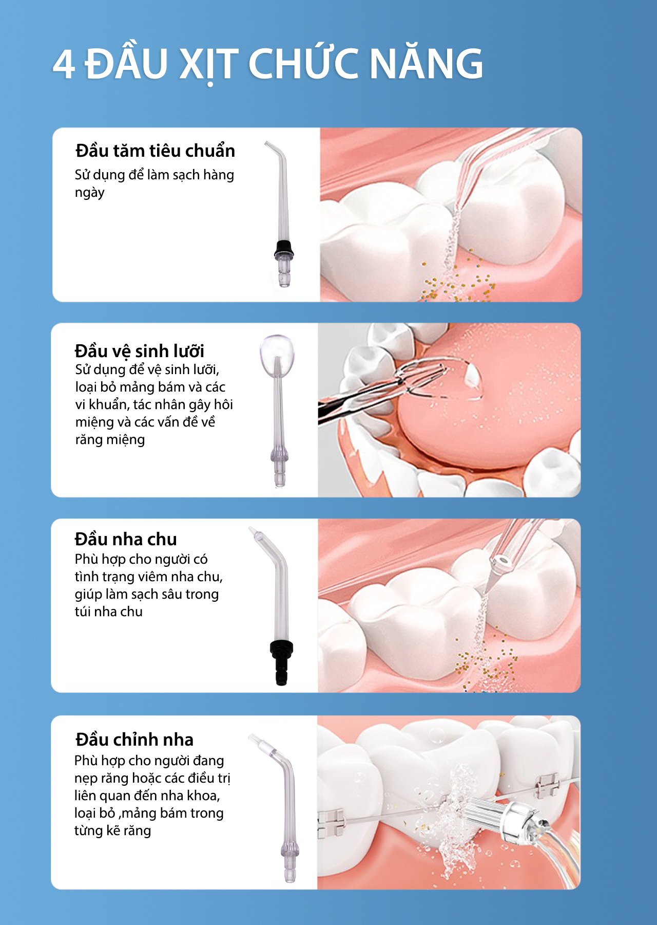 Máy tăm nước cá nhân WaterJet Flosser Slim (4 đầu tăm, dùng được cho người niềng răng, có đầu cạo lưỡi) - Để có thể làm sạch các mảng bám trên răng một cách đúng