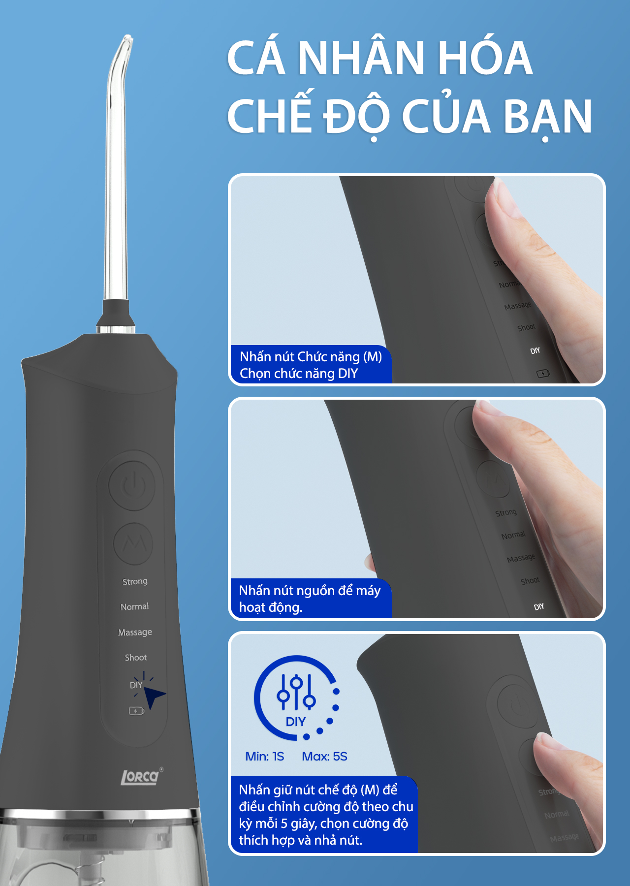 - Chế độ DIY cá nhân hóa: Người dùng có thể tự cài đặt áp lực nước phù hợp với nhu cầu riêng, đảm bảo việc chăm sóc răng miệng hiệu quả mà không gây khó chịu.