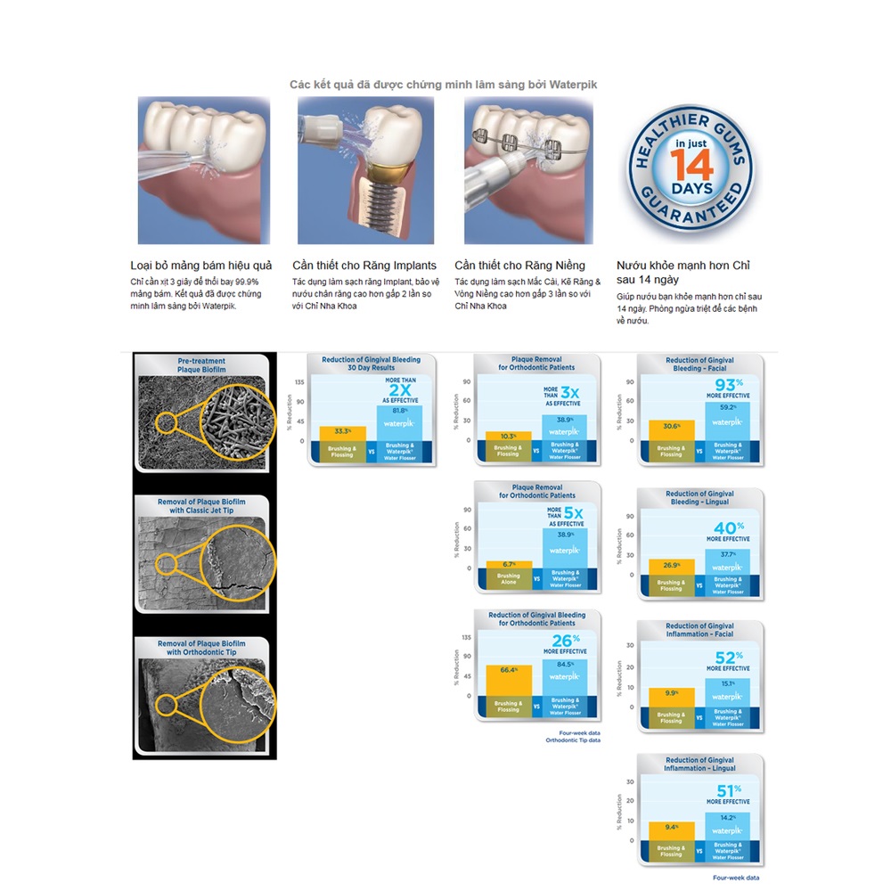 Máy tăm nước không dây giúp vệ sinh răng miệng Waterpik Cordless WP450 giúp làm sạch răng hiệu quả hơn 93% so với chỉ nha khoa, làm giảm các bệnh về nướu, chảy máu chân răng, hạn chế tình trạng nha chu, hôi miệng, loại bỏ vi khuẩn ở kẽ răng, dưới nướu, giúp nướu khỏe mạnh hơn chỉ trong 14 ngày. Công dụng: