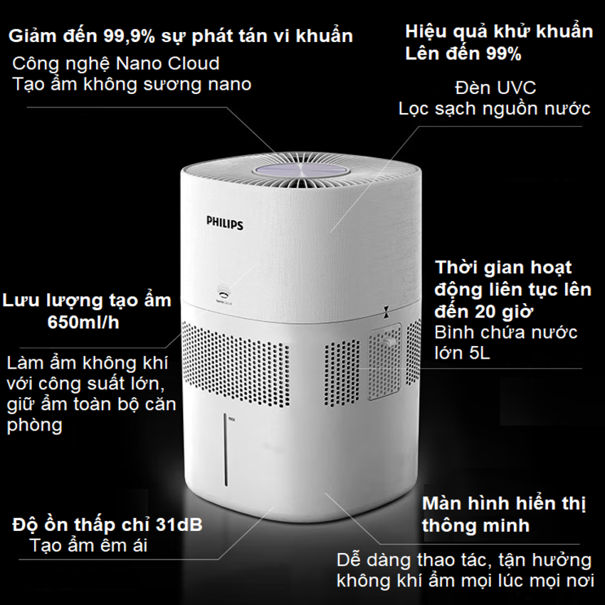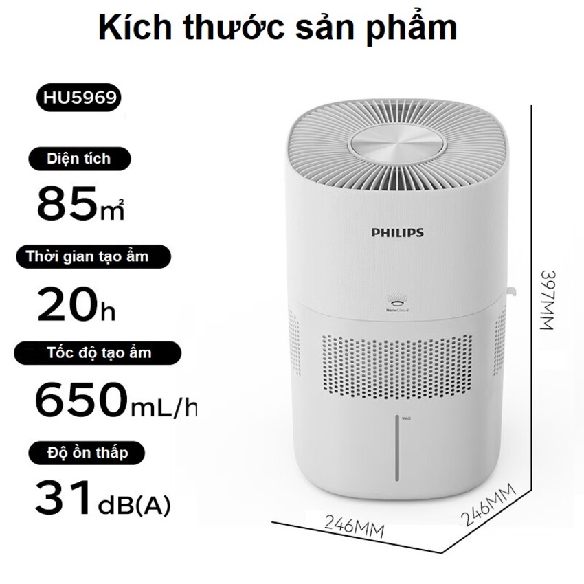 Mua tại TiktokMáy tạo độ ẩm công nghệ NanoCloud Philips HU5969 tia UV khử khuẩn - Dùng cho phòng diện tích 85m2 - Hàng nhập khẩu Philips là tên gọi phổ biến nhất của Koninklijke Philips Electronics N.V. (Royal Philips Electronics), là một công ty điện tử đa quốc gia Hà Lan và là một trong những công ty điện tử lớn nhất thế giới. Không chỉ sản xuất điện tử tiêu dùng, chiếu sáng, thiết bị y tế…Giới thiệu máy tạo độ ẩm Philips HU5969 là sản phẩm mới nhất được nâng cấp một số tính năng mới như: Đèn khử trùng tia UV, loại bỏ 99,9% vi khuẩn, thiết kế kiểu dáng hoàn toàn mới, diện tích sử dụng lên đến 85m², tốc độ tạo ẩm 650ml/giờ...