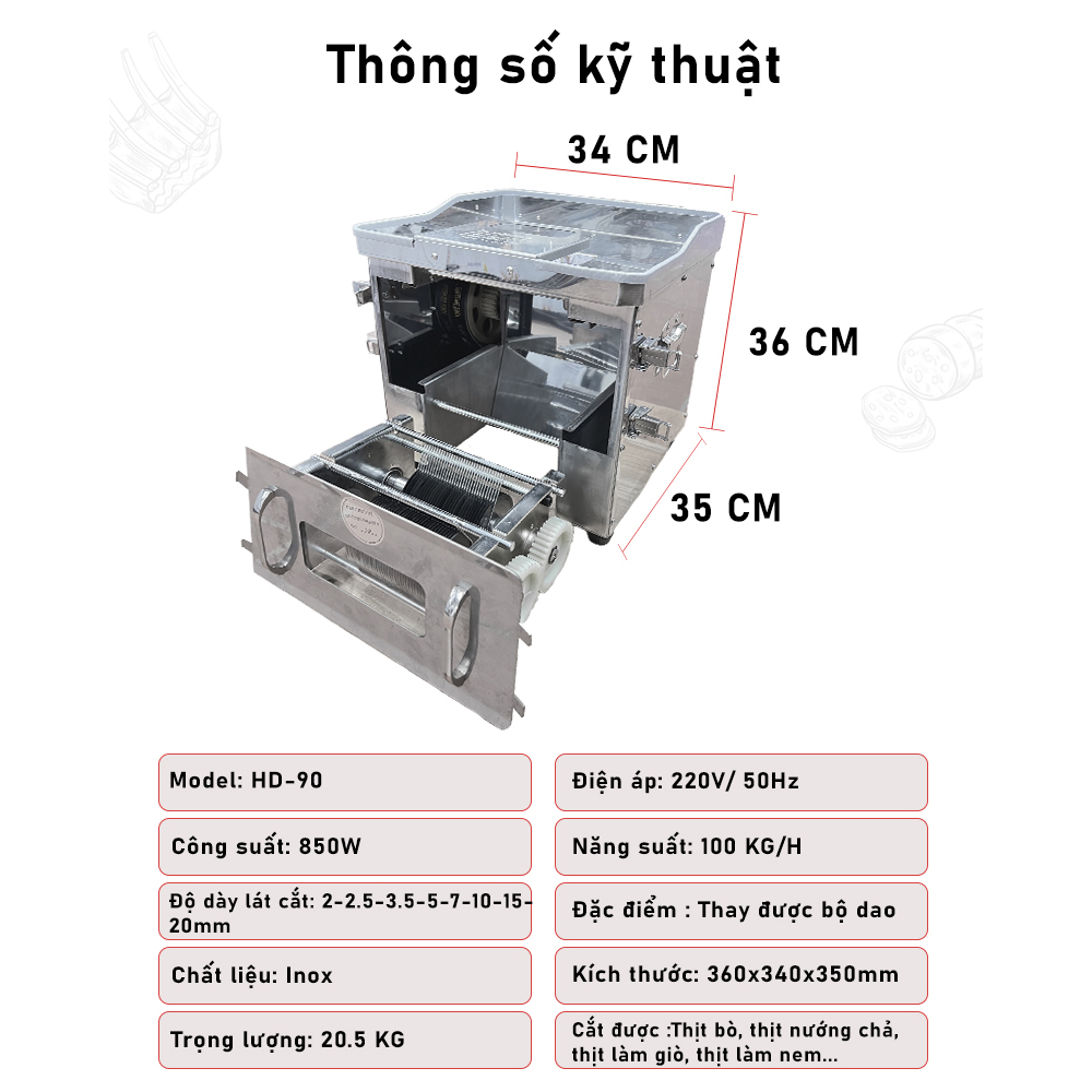 Máy thái thịt thay dao ABG HD-90 Công suất 850W, inox dày dặn, không oxy hóa, gỉ sét, motor lõi đồng nguyên chất bền bỉCấu tạoVỏ máy được làm hoàn toàn bằng inox dày dặn, không oxy hóa, không gỉ sét...