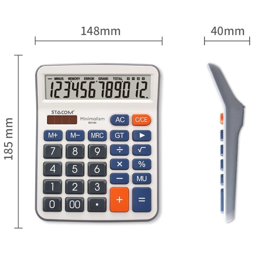 Máy Tính Stacom Ec104 Thuộc dòng máy tính cầm tay cỡ lớn, màn hình hiển thị lớn với 12 số. Hai nguồn điện cung cấp từ năng lượng ánh sáng và pin giúp máy luôn