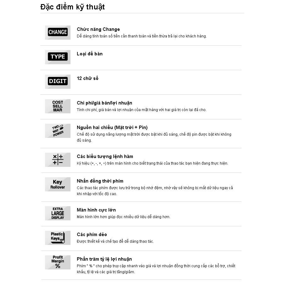 28,6(C) × 126,5(R) × 148(D) mm - Hiển thị tối đa 300 bước tính trước đó. - Chức năng kiểm tra lại cho phép xác nhận lỗi bằng âm thanh khi kiểm tra phép tính.