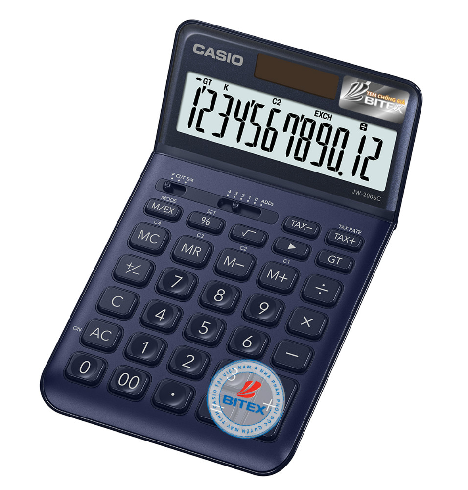 Máy Tính Để Bàn Casio JW200SC sử dụng chế độ sử dụng năng lượng mặt trời được bật khi đủ sáng, chế độ pin được bật khi không đủ sáng.
