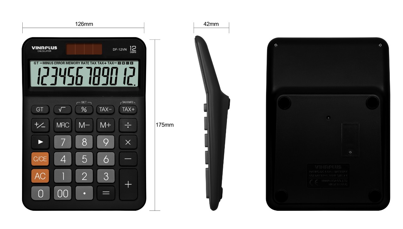 THÔNG TIN CHI TIẾT Tên sản phẩm: Máy tính DF-12VN Thương hiệu: VINAPLUS Model: DF-12VN Bảo hành: 2 năm Kích thước (dài x rộng x dày): 179,5 x 126,5 x 32,6 mm Hiển thị: 12