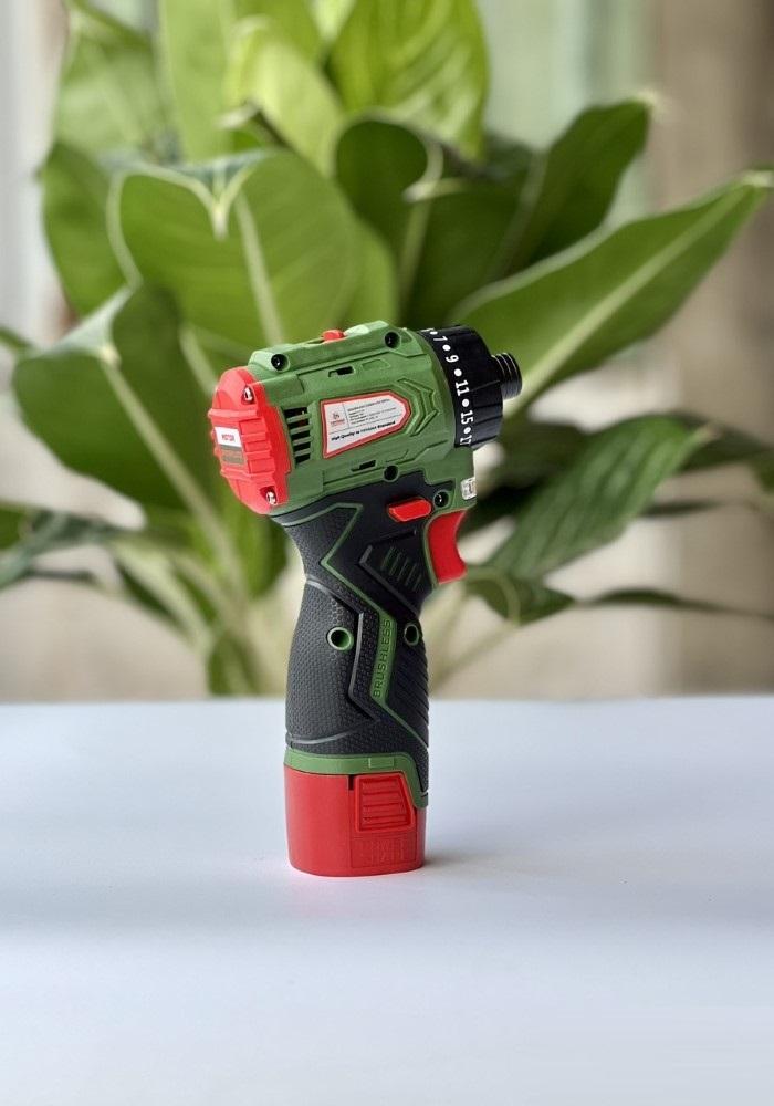 Máy khoan pin có điện thế pin 12V, đường kính mũi khoan là 10mm, chuyên dùng để khoan gỗ, thép và bắt vít. Máy khoan điều chỉnh được tốc độ ở 2 mức: • Mức
