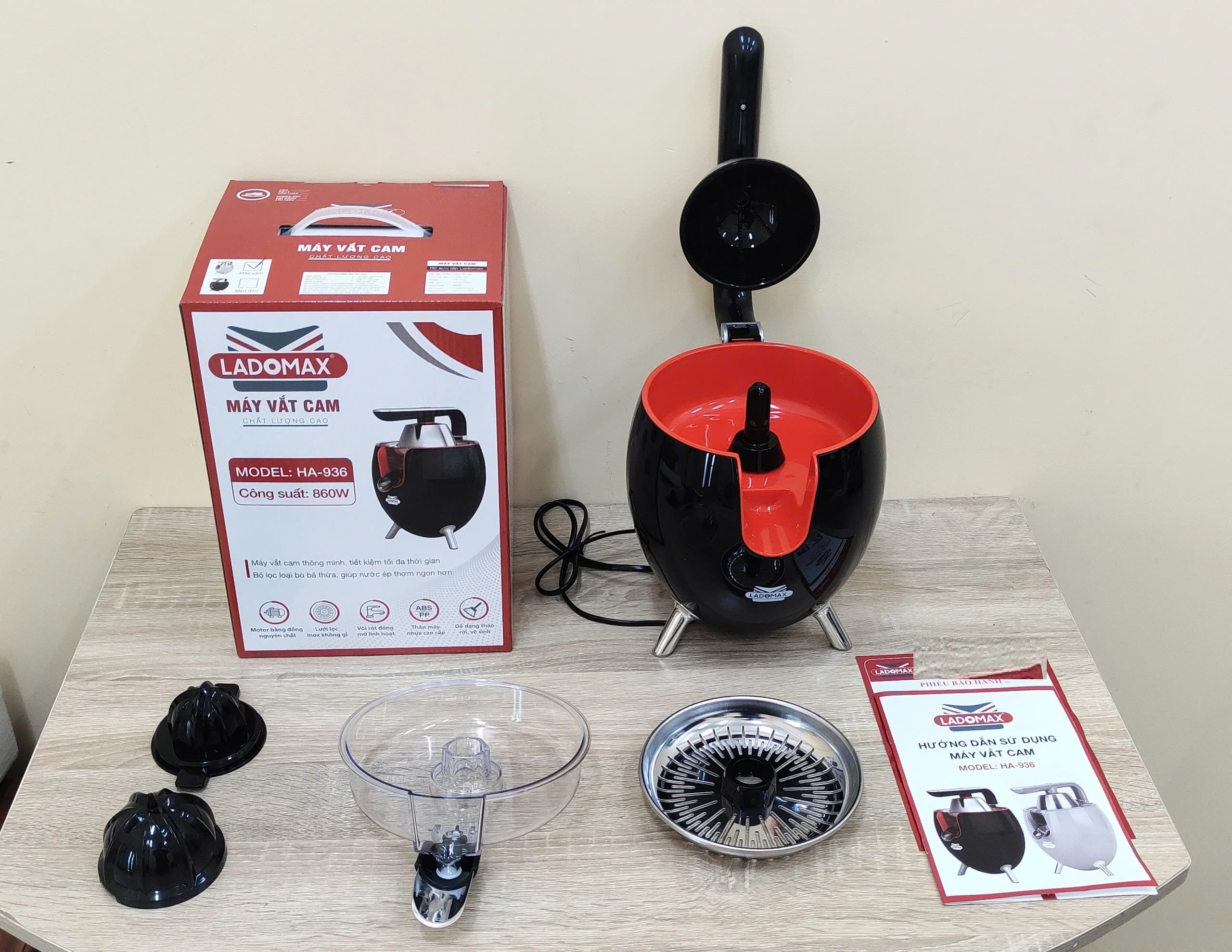 Thông tin sản phẩm Thương hiệu Ladomax chính hãng Máy: Máy vắt cam công nghiệp Công suât: 860W Model : 936 màu đen Điện áp: 220-240V, 50/60HZ Bảo hành