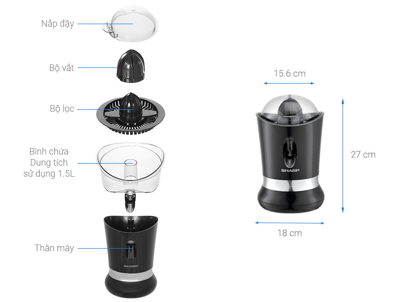 Máy vắt cam Sharp 1.5 lít EJ-J415-WH - Thiết kế nhỏ gọn, tiện lợi - Công suất: 40 W - Dung tích: 1.5 L - Chất liệu: Nhựa Trang bị 2 đầu vắt lớn, nhỏ