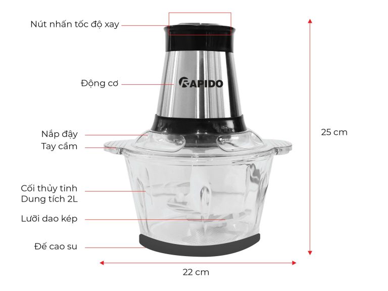 Công suất    450W Điện áp  220V/50Hz Dung tích 2.5L Màu sắc Màu Bạc Chức năng  - Xay các loại thịt, cá, tôm cua - Xay rau, củ, quả - Bóc vỏ hành tỏi Chất