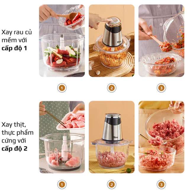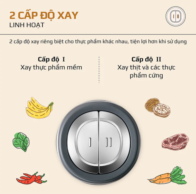 - Cấp độ I: Bánh răng chậm thích hợp xay các thực phẩm mềm: rau củ, nấm, ớt.