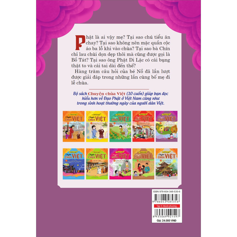 Thông qua câu chuyện bé Nồ cùng gia đình đi lễ chùa, vào chùa gặp Sư trụ trì và chú tiểu Tâm Tĩnh, bộ Mẹ kể con nghe – Chuyện chùa Việt lần lượt hé mở những kiến thức cơ bản về đạo Phật.