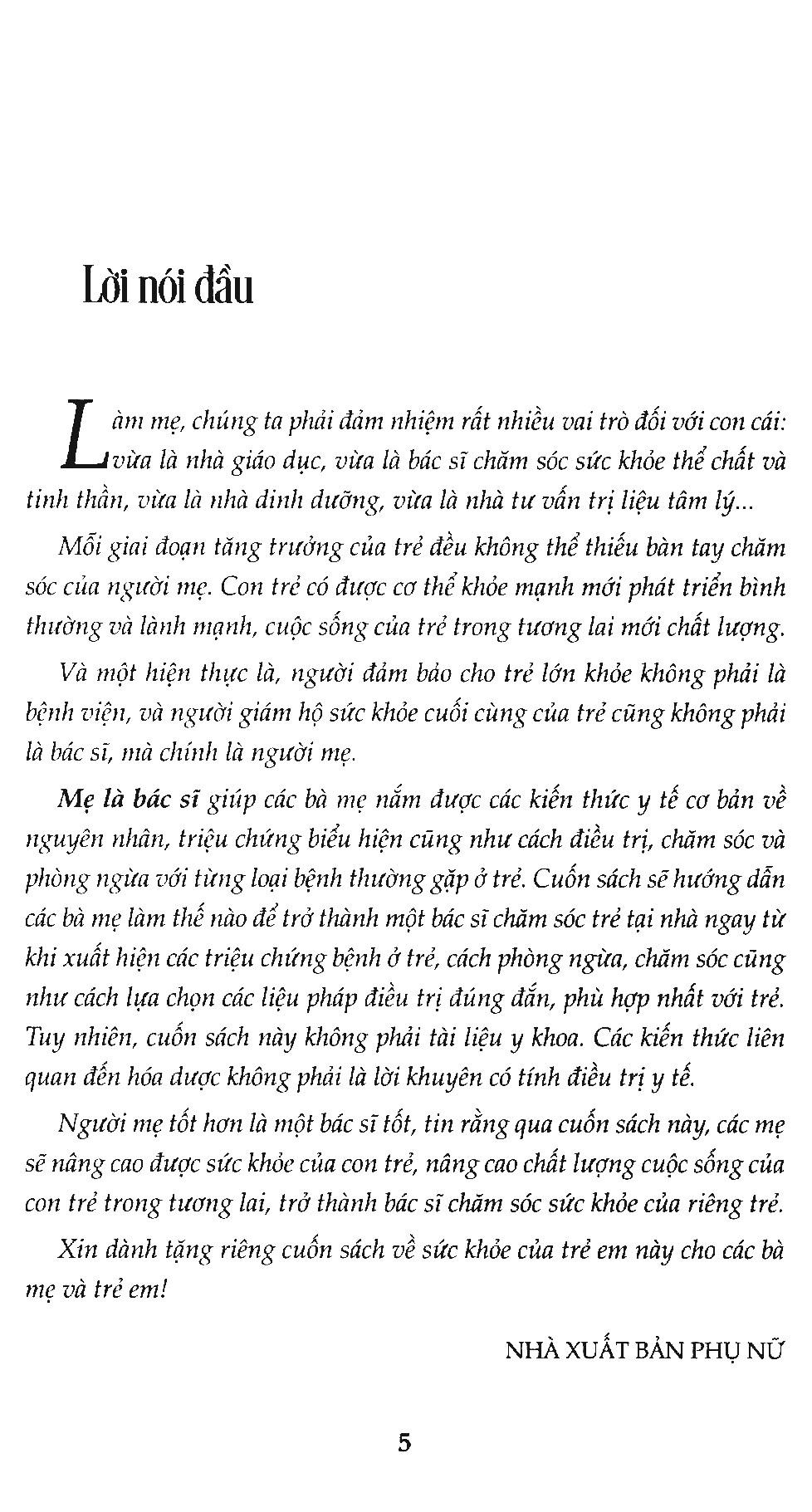 Người mẹ tốt hơn là một bác sĩ tốt, tin rằng qua cuốn sách này, các mẹ sẽ nâng cao được sức khỏe của con trẻ, nâng cao chất lượng cuộc sống của con trẻ trong tương lai, trở thành bác sĩ chăm sóc sức khỏe của riêng trẻ.