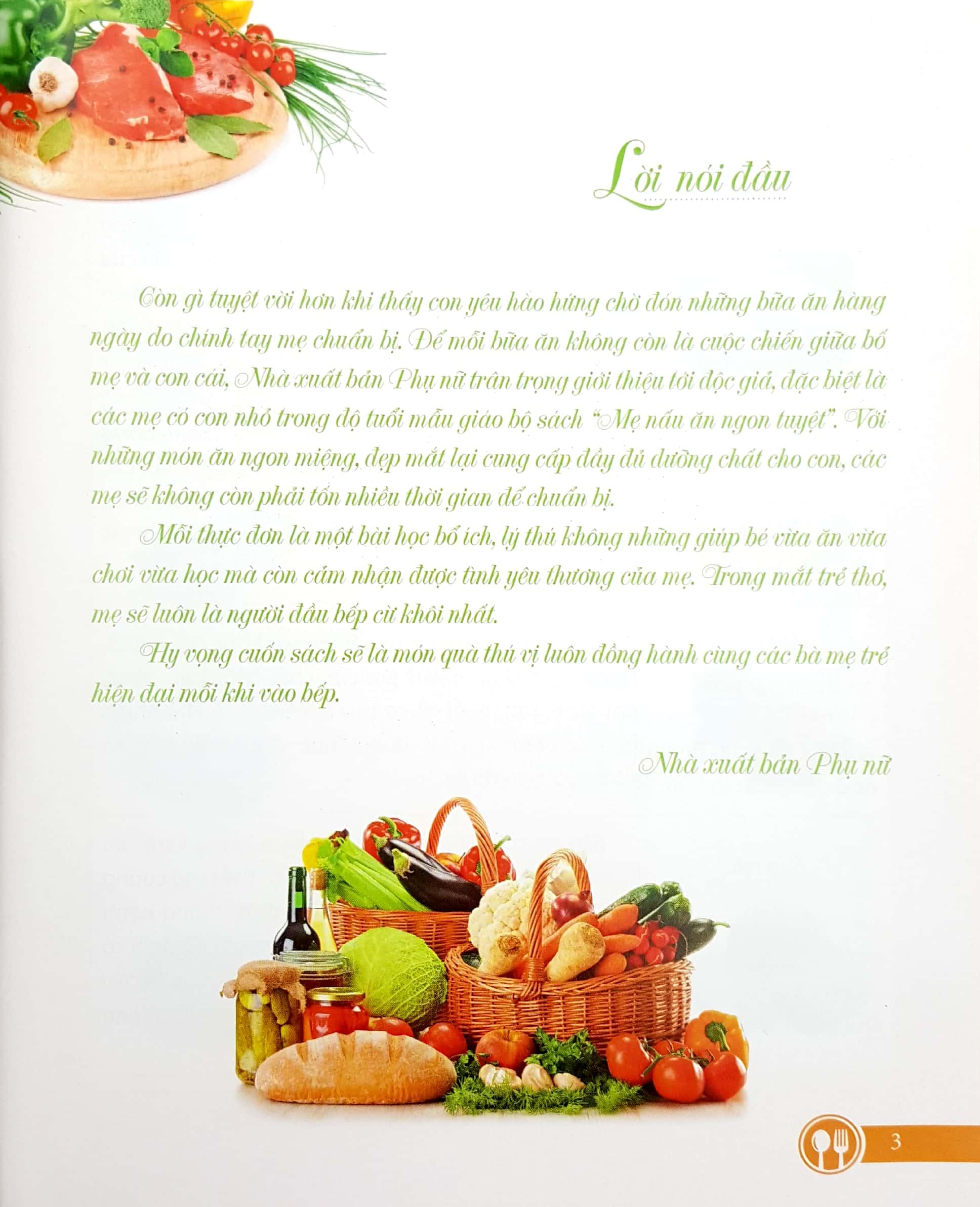 Còn gì tuyệt vời hơn khi thấy con yêu hào hứng chờ đón những bữa ăn hàng ngày do chính tay mẹ chuẩn bị. Bộ sách Mẹ nấu ăn ngon tuyệt được biên soạn dành cho các mẹ có con nhỏ trong độ tuổi mẫu giáo. Với những món ăn ngon miệng, đẹp mắt lại cung cấp đầy đủ dưỡng chất cho con, các mẹ sẽ không còn phải tốn nhiều thời gian để suy nghĩ.