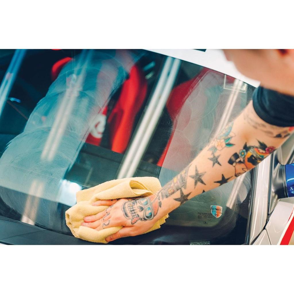 • Dùng khăn Meguiar’s microfiber tiêu chuẩn lau sạch lớp hóa chất vừa thoa cho đến khi bề mặt kính trở nên sáng bóng.