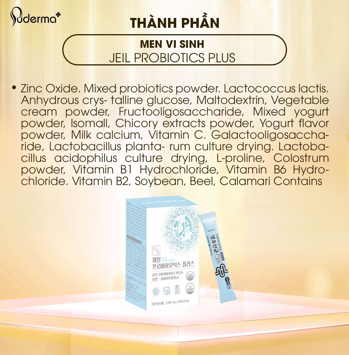 Zinc Oxide. Mixed probiotics powder. Lactococcus lactis. Anhydrous crys- talline glucose, Maltodextrin, Vegetable cream powder, Fructooligosaccharide, Mixed yogurt powder, Isomall, Chicory extracts powder, Yogurt flavor powder, Milk calcium, Vitamin C. Galactooligosaccharide, Lactobacillus planta- rum culture drying. Lactobacillus acidophilus culture drying, L-proline, Colostrum powder, Vitamin B1 Hydrochloride, Vitamin B6 Hydro- chloride. Vitamin B2, Soybean, Beel, Calamari Contains