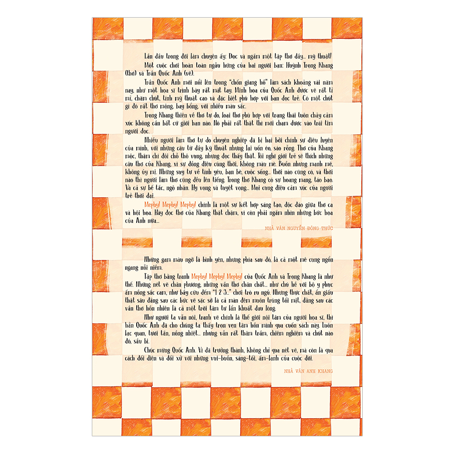 Là một tập thơ đầy hồn nhiên, trong trẻo, Mephy! Mephy! Mephy! viết về đề tài tình yêu bằng chất giọng lạ nhưng cực kỳ cuốn hút. Với gam màu cam chủ đạo cùng chú hề Mephy nhí nhảnh, cuốn sách đưa người đọc đi từ cung bậc này trải dài theo những miền miên viễn cảm xúc khác để sau cùng đọng lại trong trái tim mỗi người là sự da diết, hối tiếc và day dứt khôn nguôi.