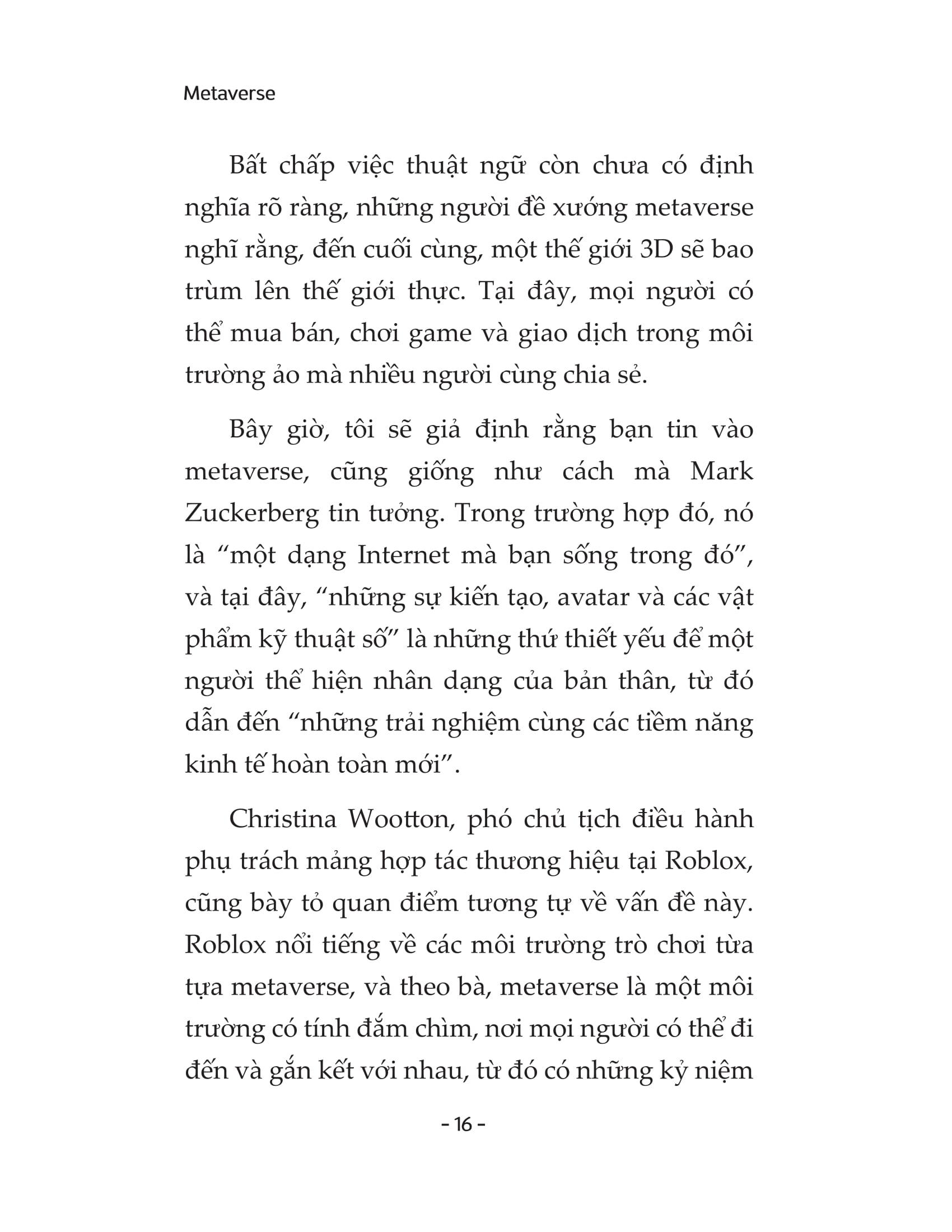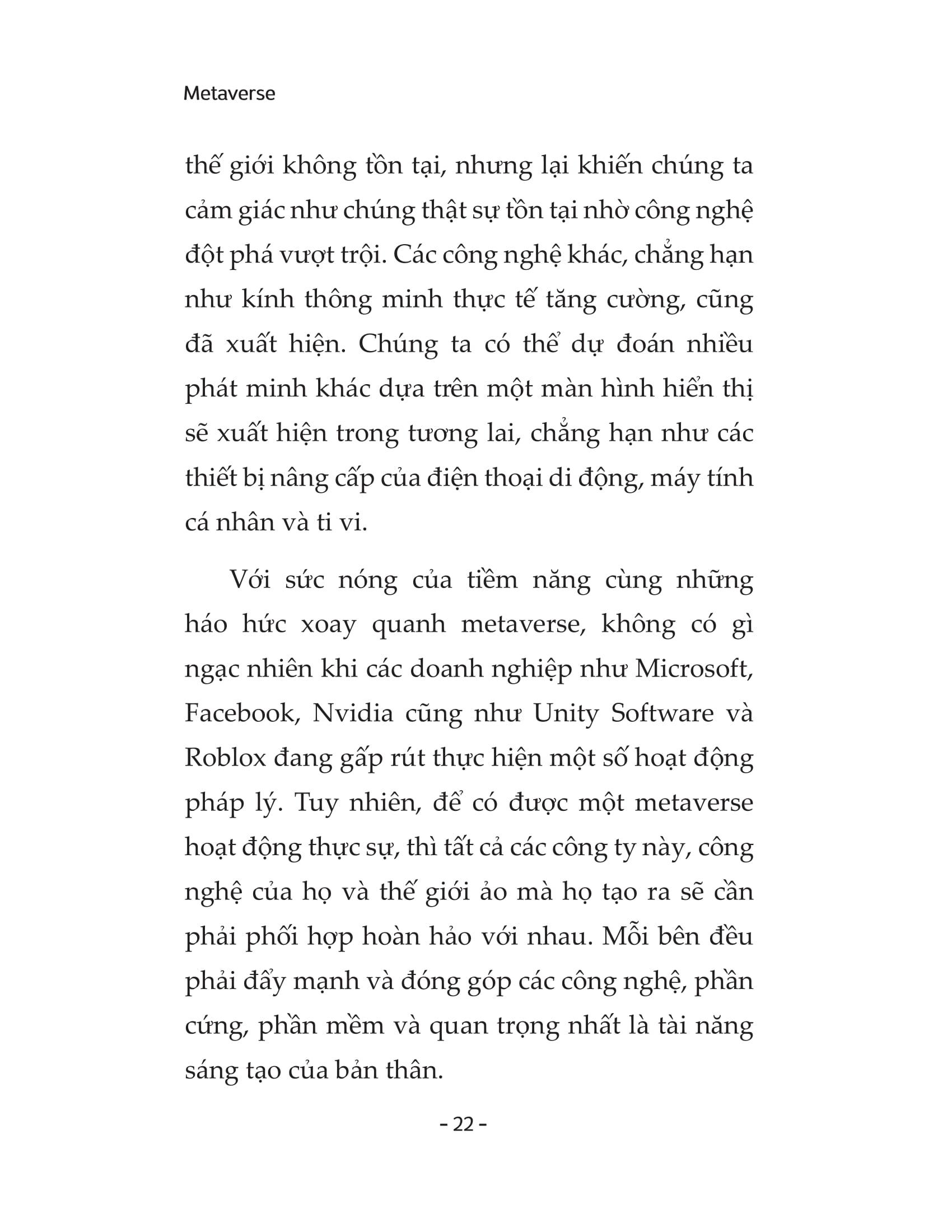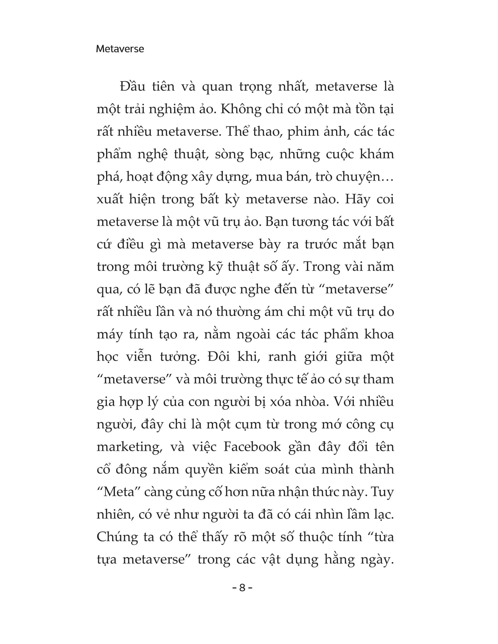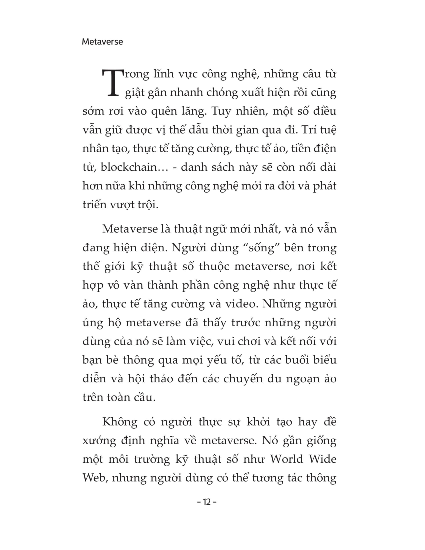 Khái niệm metaverse xuất hiện lần đầu tiên trong tiểu thuyết khoa học viễn tưởng, mô tả một xã hội trong đó các cá nhân say mê những avatar ảo, các công ty máy tính đa quốc gia nắm giữ quyền lực lớn hơn cả chính phủ và cuộc sống vật chất thì liên tục xuống cấp. Liệu chúng ta có thể duy trì thái độ bàng quan, “chuyện gì đến sẽ đến” đối với tương lai của mình nữa không, khi khoa học ngày nay đã bắt kịp với những tình tiết tưởng như chỉ có trong tiểu thuyết khoa học viễn tưởng? Cuốn sách METAVERSE đưa ra bức tranh toàn cảnh để nhấn mạnh rằng, con người không thể chỉ thụ động chờ đợi, mà cần nêu lên nhiều câu hỏi, tư duy đa góc độ và đưa ra các quyết định một cách cẩn thận, có đạo đức - nhất là khi chúng ta đang tự tay xây dựng tương lai của mình bằng cách sử dụng khoa học và công nghệ.