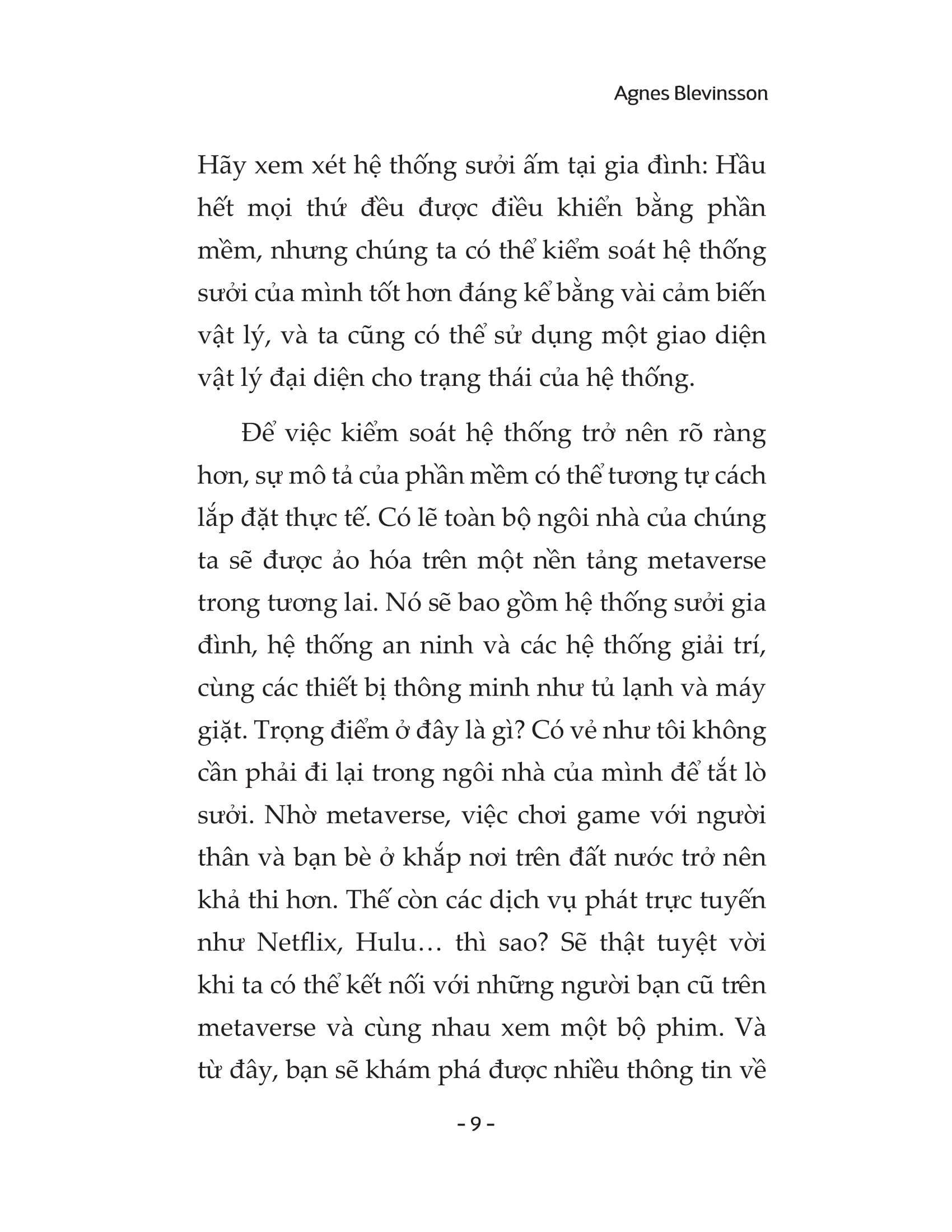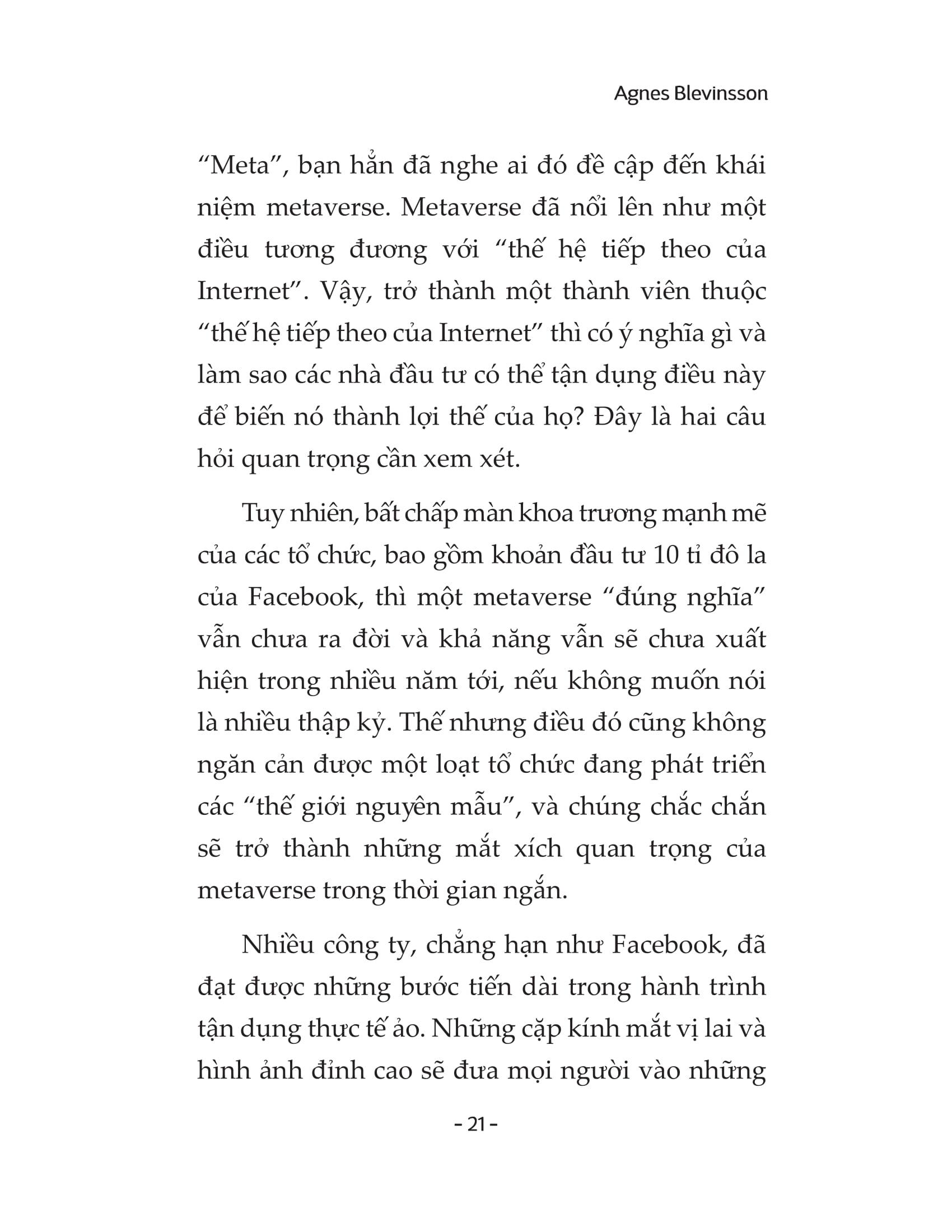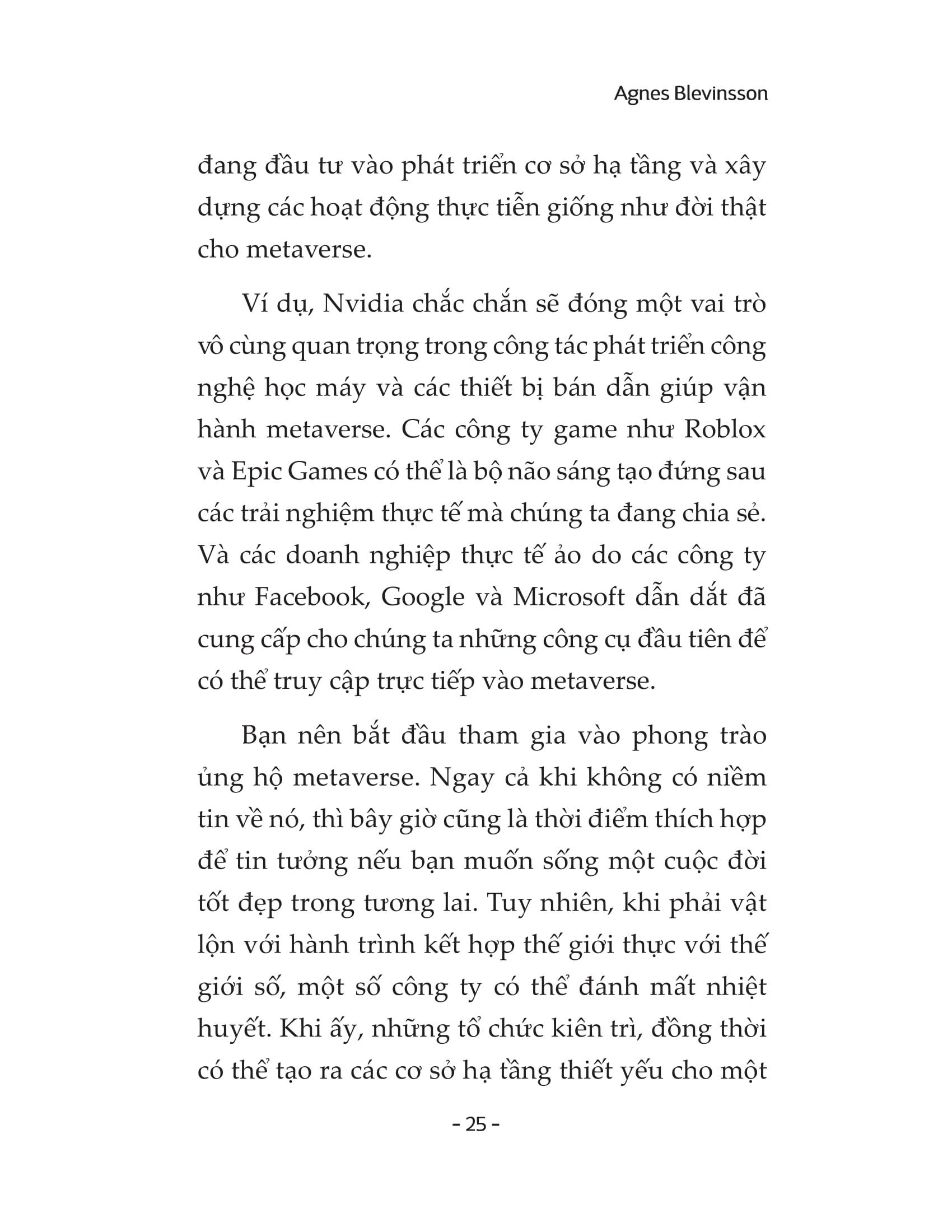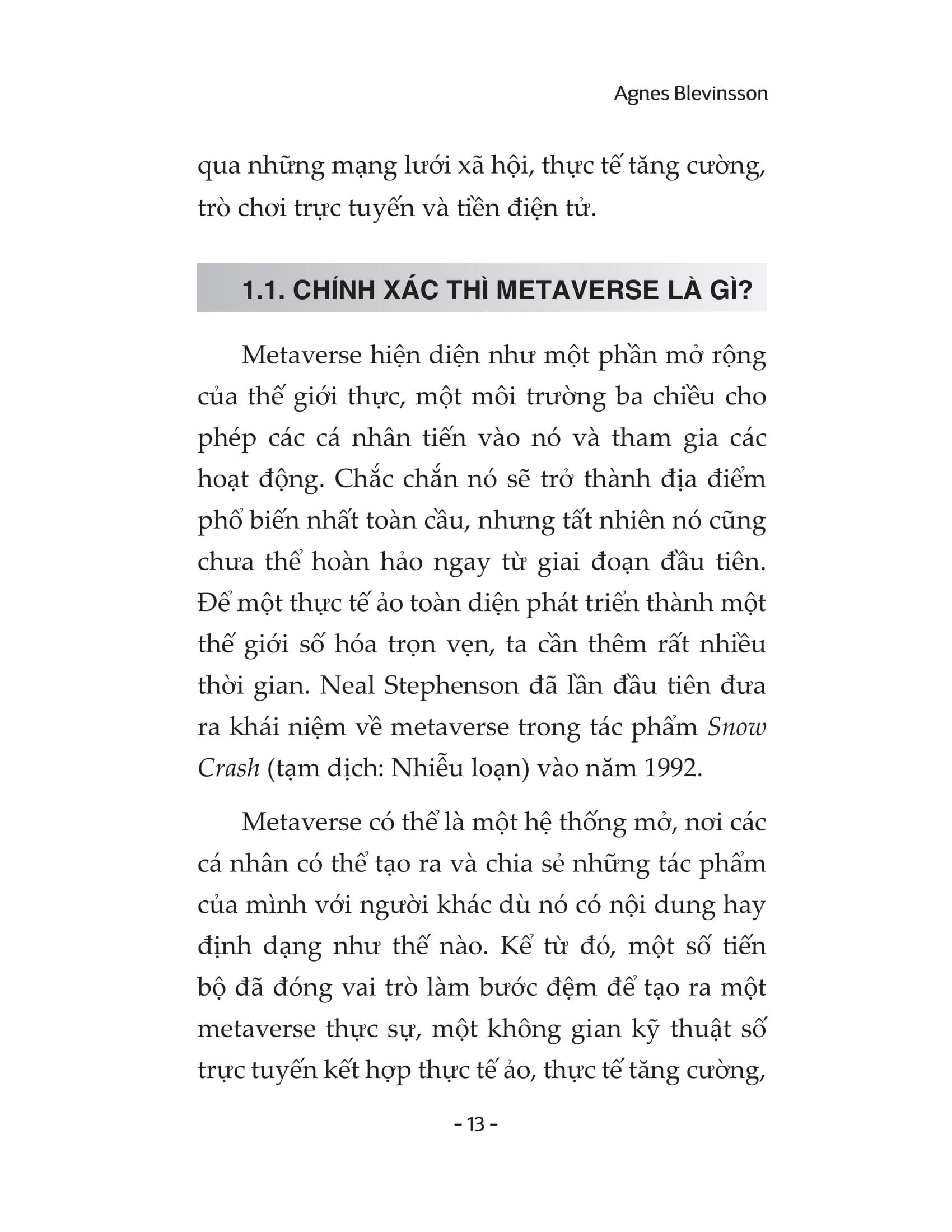 Khái niệm metaverse xuất hiện lần đầu tiên trong tiểu thuyết khoa học viễn tưởng, mô tả một xã hội trong đó các cá nhân say mê những avatar ảo, các công ty máy tính đa quốc gia nắm giữ quyền lực lớn hơn cả chính phủ và cuộc sống vật chất thì liên tục xuống cấp. Liệu chúng ta có thể duy trì thái độ bàng quan, “chuyện gì đến sẽ đến” đối với tương lai của mình nữa không, khi khoa học ngày nay đã bắt kịp với những tình tiết tưởng như chỉ có trong tiểu thuyết khoa học viễn tưởng? Cuốn sách METAVERSE đưa ra bức tranh toàn cảnh để nhấn mạnh rằng, con người không thể chỉ thụ động chờ đợi, mà cần nêu lên nhiều câu hỏi, tư duy đa góc độ và đưa ra các quyết định một cách cẩn thận, có đạo đức - nhất là khi chúng ta đang tự tay xây dựng tương lai của mình bằng cách sử dụng khoa học và công nghệ.