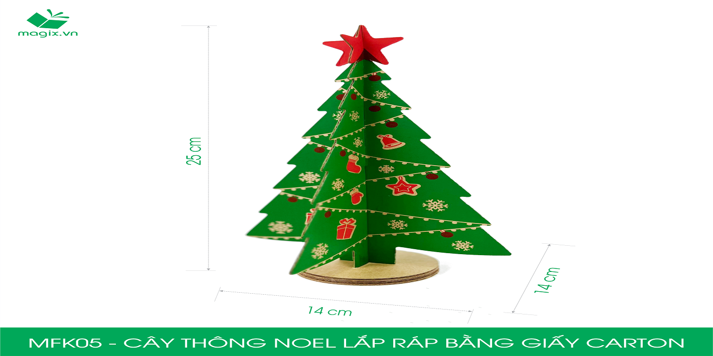 Cây thông Noel lắp ráp bằng giấy carton là một sản phẩm trang trí lý tưởng cho mùa Noel. Bạn có thể đặt sản phẩm trên bàn làm việc, ngăn tủ, kệ gỗ để trang trí. Với thiết kế đơn giản được in ấn cùng với sắc đỏ và xanh lá, sản phẩm sẽ giúp cho không gian làm việc/ trang trí của bạn đầy ấn tượng; hoặc bạn có thể dùng để làm quà tặng ý nghĩa cho các bé/ đồng nghiệp mùa Giáng sinh.