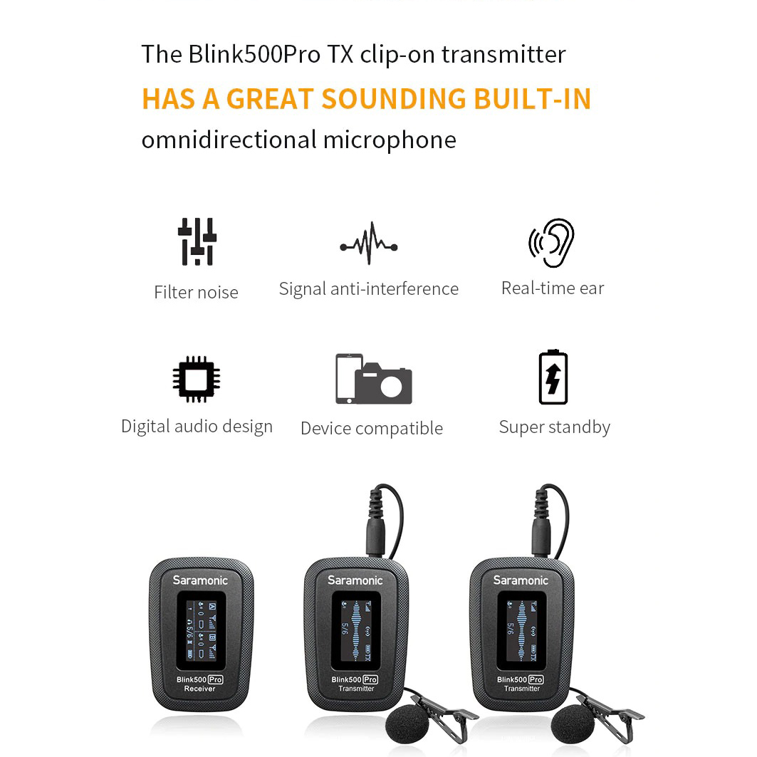 Kết hợp tính chất siêu nhỏ gọn và cực kỳ dễ sử dụng của phiên bản Blink500 cũ, phiên bản Blink500 Pro với những nâng cấp cao cấp như màn hình OLED sắc nét, chế độ đầu ra mono/stereo, thời lượng pin cao hơn 60% và tăng gấp đôi phạm vi hoạt động (lến tới 100m). Saramonic Blink500 Pro B1 mang đến cho các nhà quay phim một giải pháp thu âm chuyên nghiệp khi ghi hình vào máy ảnh, máy quay, điện thoại thông minh hoặc máy tính bảng của bạn.