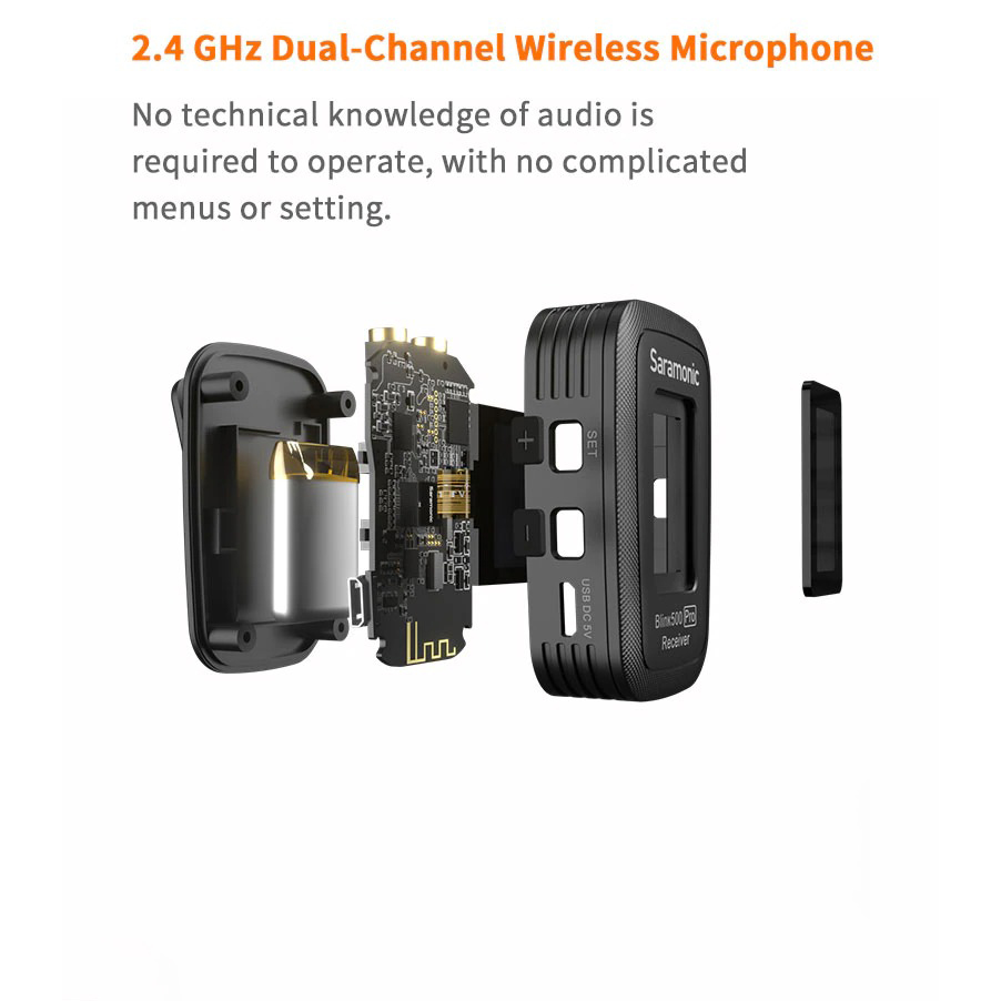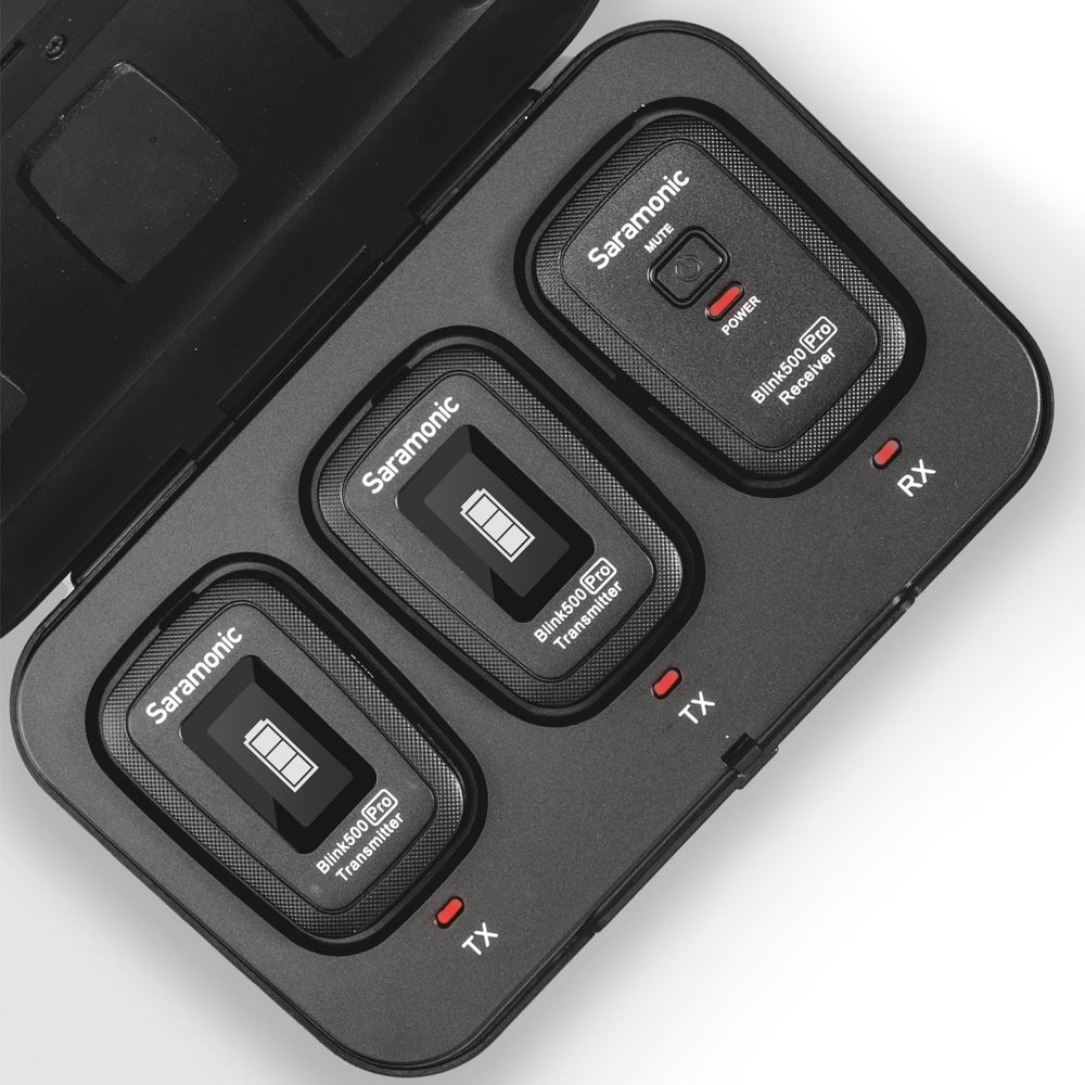 Saramonic Blink500 Pro B2 Saramonic Blink 500 Pro B2(TX+TX+RX) là bộ Microphone không dây tiện dụng, nhẹ, nhỏ gọn, dùng cho máy ảnh DSLR, Mirrorless và máy quay phim, hoặc các thiết bị di động, mang
