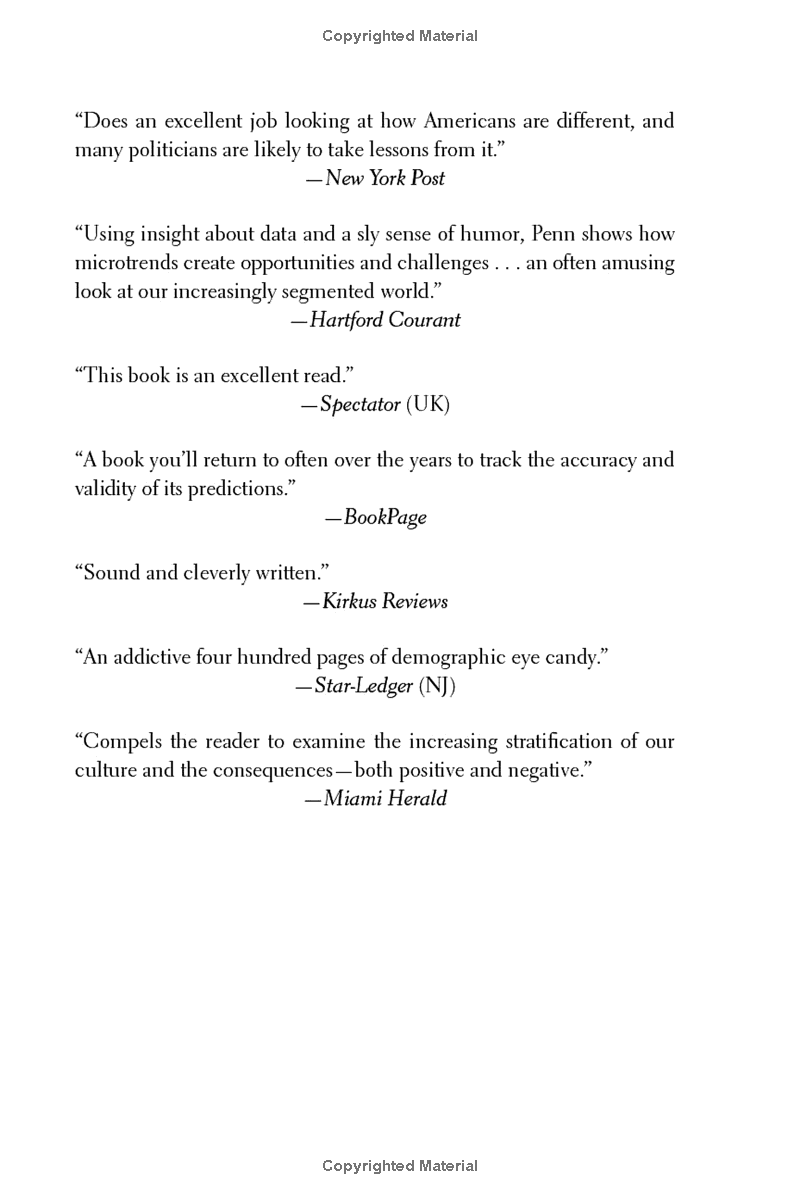 Penn shows readers how to identify the microtrends that can transform a business enterprise, tip an election, spark a movement, or change your life. In today's world, small groups can have the biggest impact.
