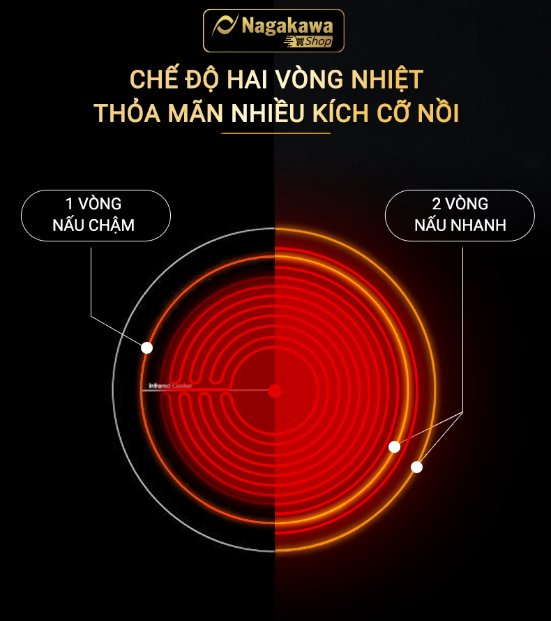 Với bếp đôi điện từ hồng ngoại Nagakawa NAG1252M, bạn hoàn toàn có thể lựa chọn chế độ hoạt động một vòng nhiệt hoặc hai vòng nhiệt.