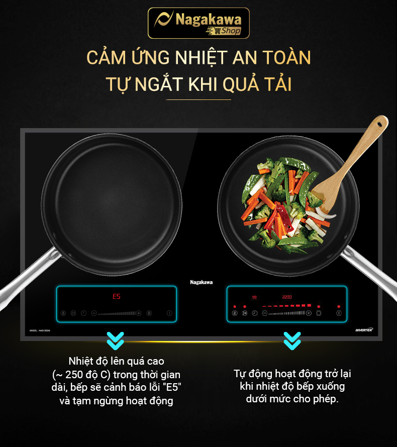 Các chuyên gia bếp của Nagakawa đã nghiên cứu để đưa chức năng này vào bếp đôi điện từ hồng ngoại Nagakawa NAG1252M, giải quyết và ngăn chặn nhiệt độ nóng của bếp hồng ngoại tỏa ra, tránh làm ảnh hưởng đến hệ thống mạch điều khiển và tuổi thọ của bếp.