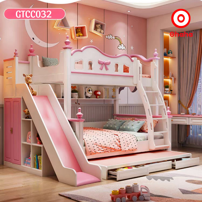 Giường tầng GTCC032 mang phong cách hiện đại tươi trẻ và ngọt ngào cùng đa dạng kiểu dáng như thang treo cho phòng có diện tích nhỏ, thang hộc cho khách hàng tối ưu không gian, hay loại có cầu trượt làm không gian vui chơi cho bé.