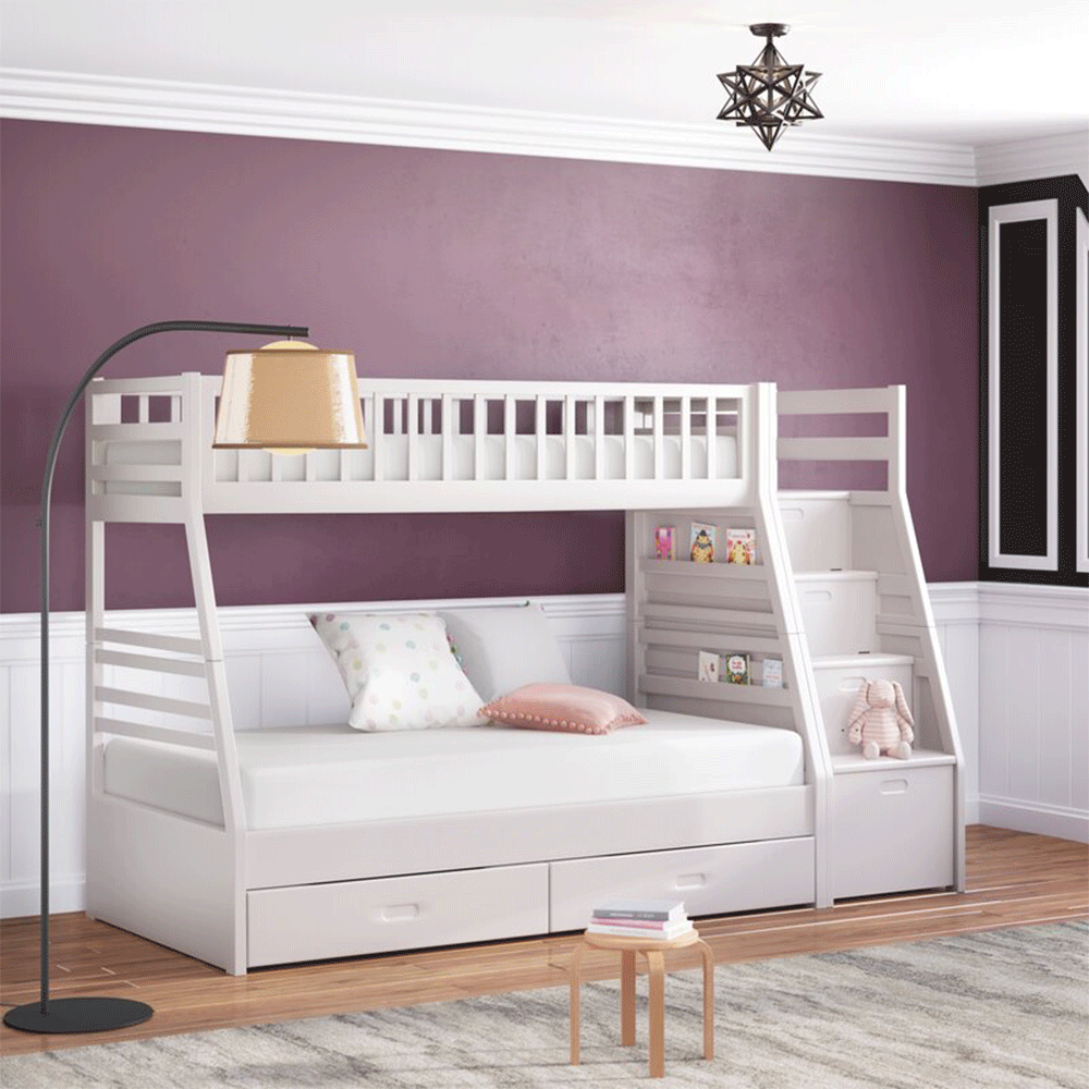 Giường tầng không chỉ giúp tiết kiệm không gian, mà còn là thế giới riêng của các bé. Giường tầng xuất khẩu Exeter được thiết kế tối giản với 2 tầng sole, thang hộc di động tiện lợi. Khoảng cách giữa 2 tầng rộng rãi không sợ đụng đầu, kể cả với người lớn. Chất liệu gỗ thông xẻ sấy nhập khẩu được gia công tỉ mỉ, kết cấu chắc chắn, giúp các bé vui chơi an toàn và có những giấc ngủ ngon.