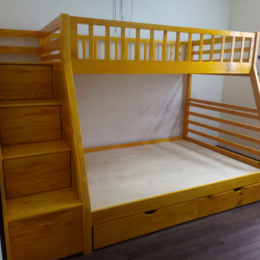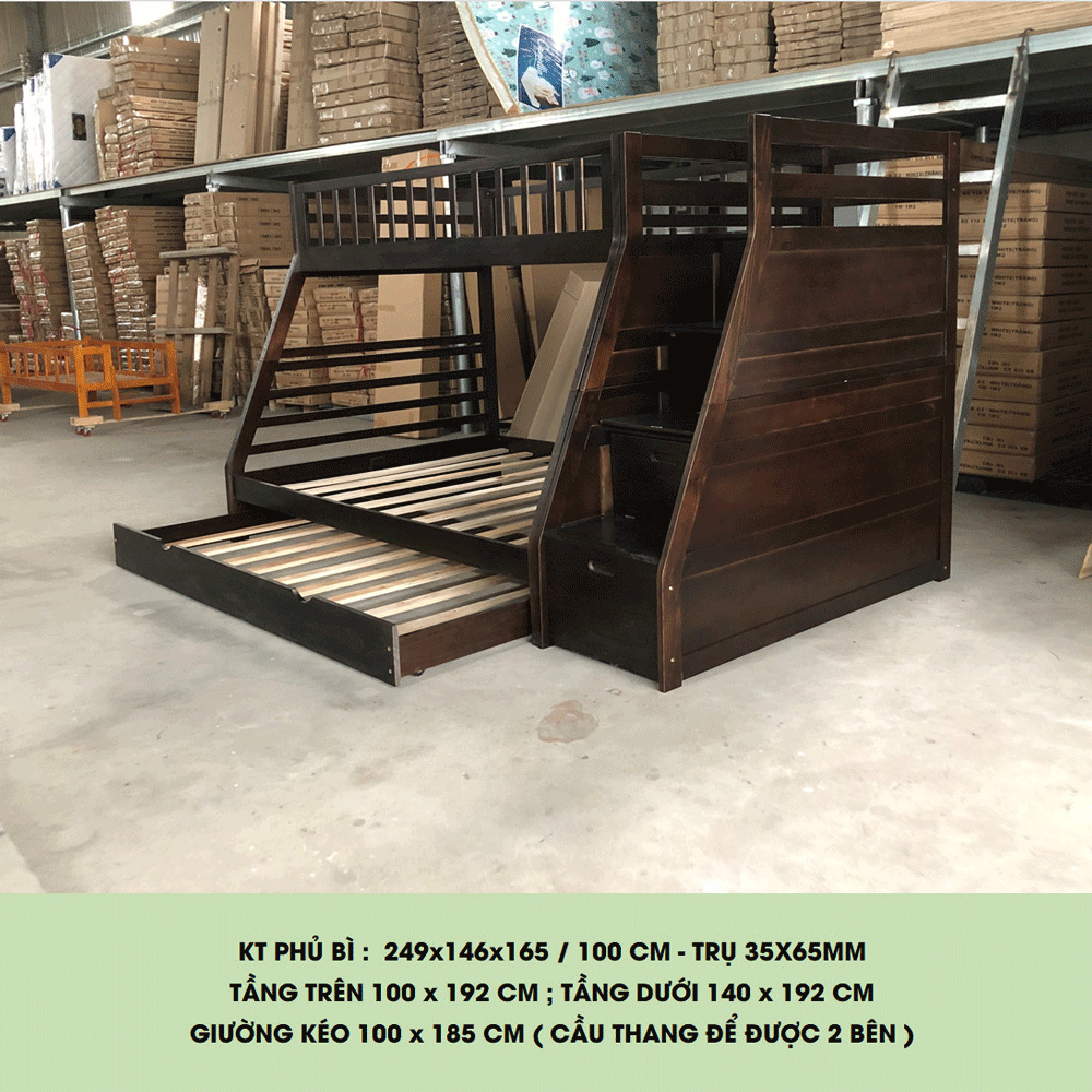 + Chất liệu: Khung giường gỗ thông Newzealand, phân tầng, Vách, đáy hộc gỗ công nghiệp, thang giường MDF chịu lực + Kích thước: kích thước phủ bì, tầng trên ưới 1mx2m Giường tầng hộp