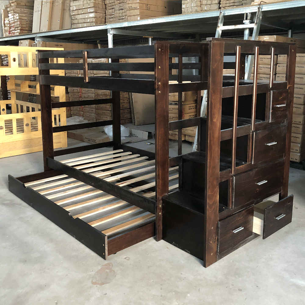 + Chất liệu: Khung giường gỗ thông Newzealand, phân tầng, Vách, đáy hộc gỗ công nghiệp, thang giường MDF chịu lực + Kích thước: kích thước phủ bì, tầng trên ưới 1mx2m Giường tầng hộp