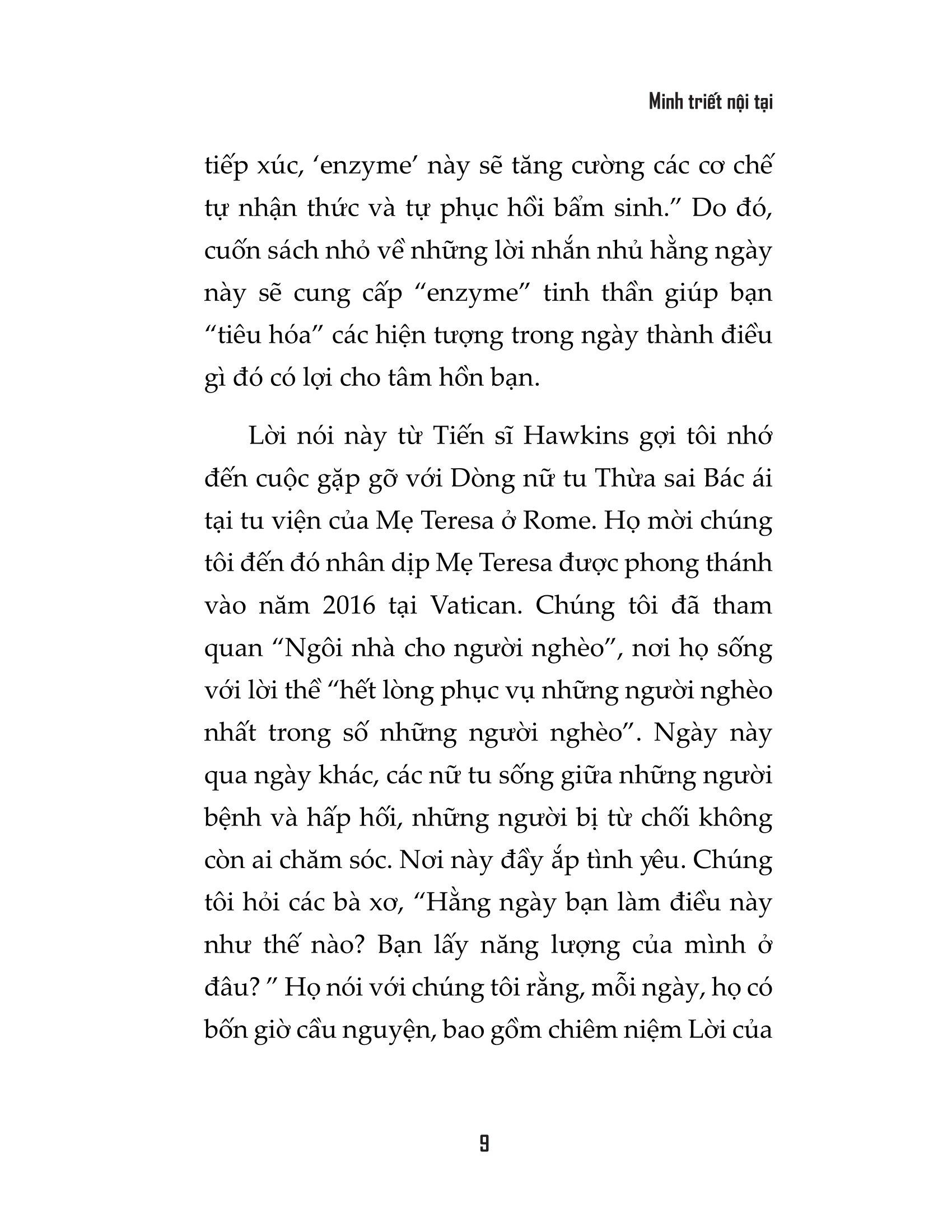“Minh Triết Nội Tại” không trả lời những câu hỏi ấy. Cuốn sách không đóng vai trò như cẩm nang giải đáp mọi bí ẩn trong vũ trụ, mà là cuốn nhật ký hàng ngày, mang những thông điệp chân lý được tìm thấy trong các giới luật của tôn giáo phương Tây với cốt lõi của triết học phương Đông, bắc cầu nối giữa thế giới vật chất, quen thuộc với lĩnh vực tâm linh, phi tuyến tính. Những lời nhắn trong sách được tuyển chọn cẩn thận, mang đến cho độc giả một suy ngẫm mới mỗi ngày. Bất kỳ đoạn nào trong số này, nếu được hiểu đầy đủ, đều có thể nâng cao mức độ tỉnh thức của một người.
