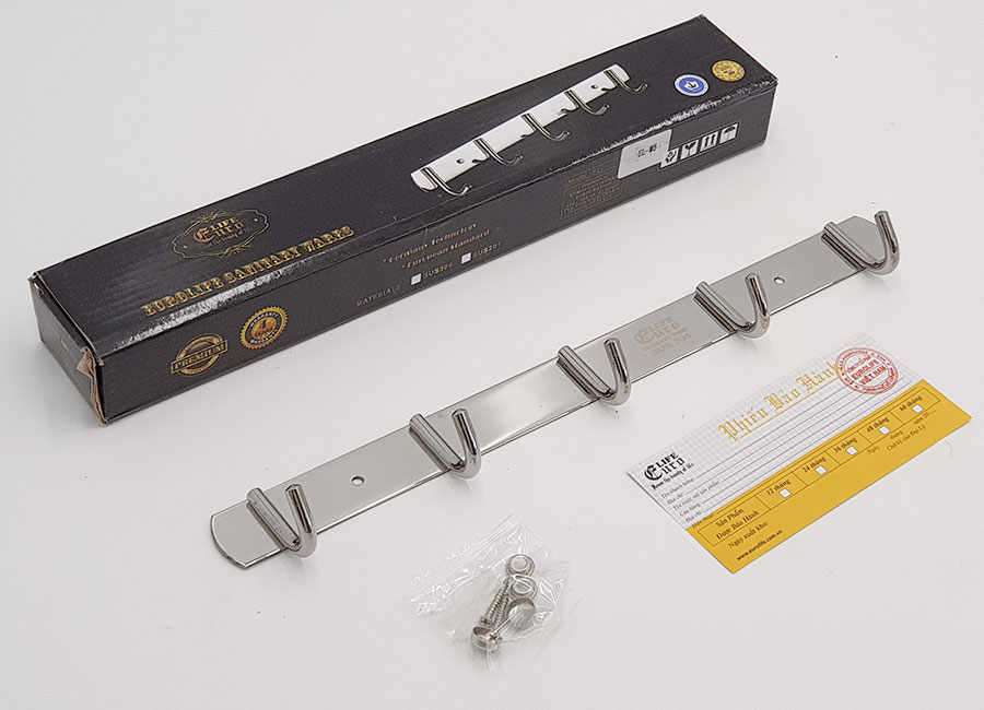Chấu treo được đúc bằng Inox SUS 304 chắc chắn, thanh đỡ chính bằng Inox mạ Chrome sáng bóng treo tối đa đồ khi cần thiết.