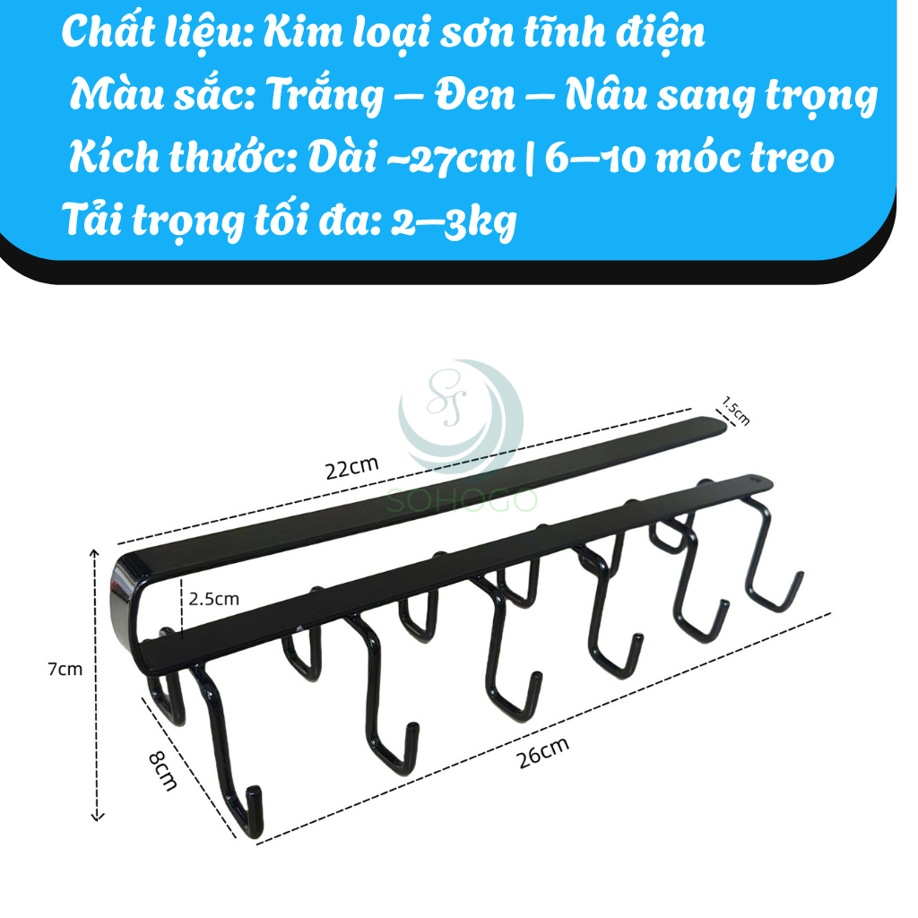 Tên sản phẩm: Móc Treo Đa Năng Gắn Dưới Kệ Tủ Bếp Chất liệu: Kim loại sơn tĩnh điện Màu sắc: Trắng – Đen – Nâu sang trọng Kích thước: Dài ~27cm | 6–10 móc treo Tải trọng tối đa: 2–3kg