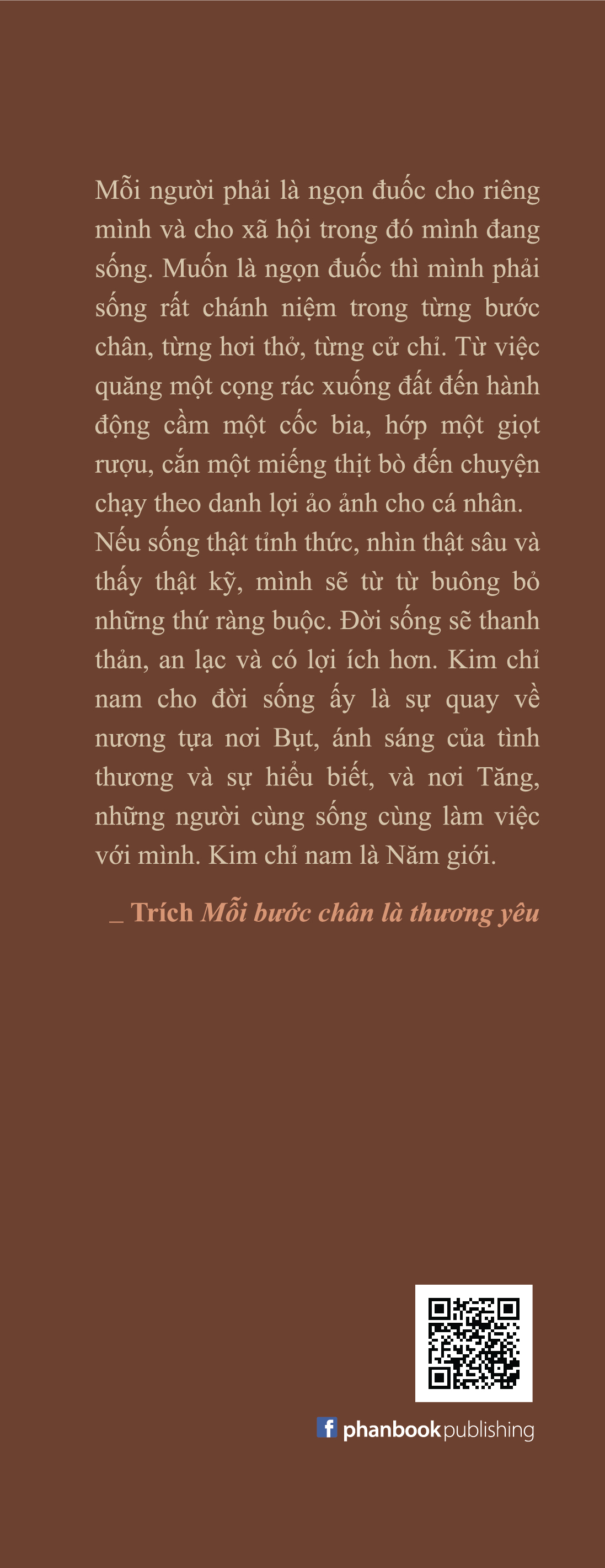 Tăng thân Làng Mai biên soạn "Mỗi người phải là ngọn đuốc cho riêng mình và cho xã hội trong đó mình đang sống. Muốn là ngọn đuốc thì mình phải sống rất chánh niệm trong từng bước chân, từng hơi thở, từng cử chỉ. Từ việc quăng một cọng rác xuống đất đến hành động cầm một cốc bia, hớp một giọt rượu, cắn một miếng thịt bò đến chuyện chạy theo danh lợi ảo ảnh cho cá nhân. Nếu sống thật tỉnh thức, nhìn thật sâu và thấy thật kỹ, mình sẽ từ từ buông bỏ những thứ ràng buộc. Đời sống sẽ thanh thản, an lạc và có lợi ích hơn. Kim chỉ nam cho đời sống ấy là sự quay về nương tựa nơi Bụt, ánh sáng của tình thương và sự hiểu biết, và nơi Tăng, những người cùng sống cùng làm việc với mình. Kim chỉ nam là Năm giới.." trích Mỗi bước chân là thương yêu "Chúng ta không có gì để hiến tặng cho cuộc đời, nếu chúng ta không có một ít thảnh thơi, vững chãi và an lạc. Cách đi, đứng, nói, cười của chúng ta chứng tỏ chúng ta có những chất liệu ấy hay không. Nhìn vào là biết. Chất liệu thật của một người xuất gia là chánh niệm. Thấy được năng lượng chánh niệm nơi ta, quần chúng sẽ phát khởi niềm tin. Các vị phải đi, đứng, nói, cười như thế nào để Phật Pháp có thể có mặt một cách đích thực. Phật Pháp không phải là kinh sách, là những bài giảng. Phật Pháp là sự sống hàng ngày của chúng ta." Thiền sư Thích Nhất Hạnh