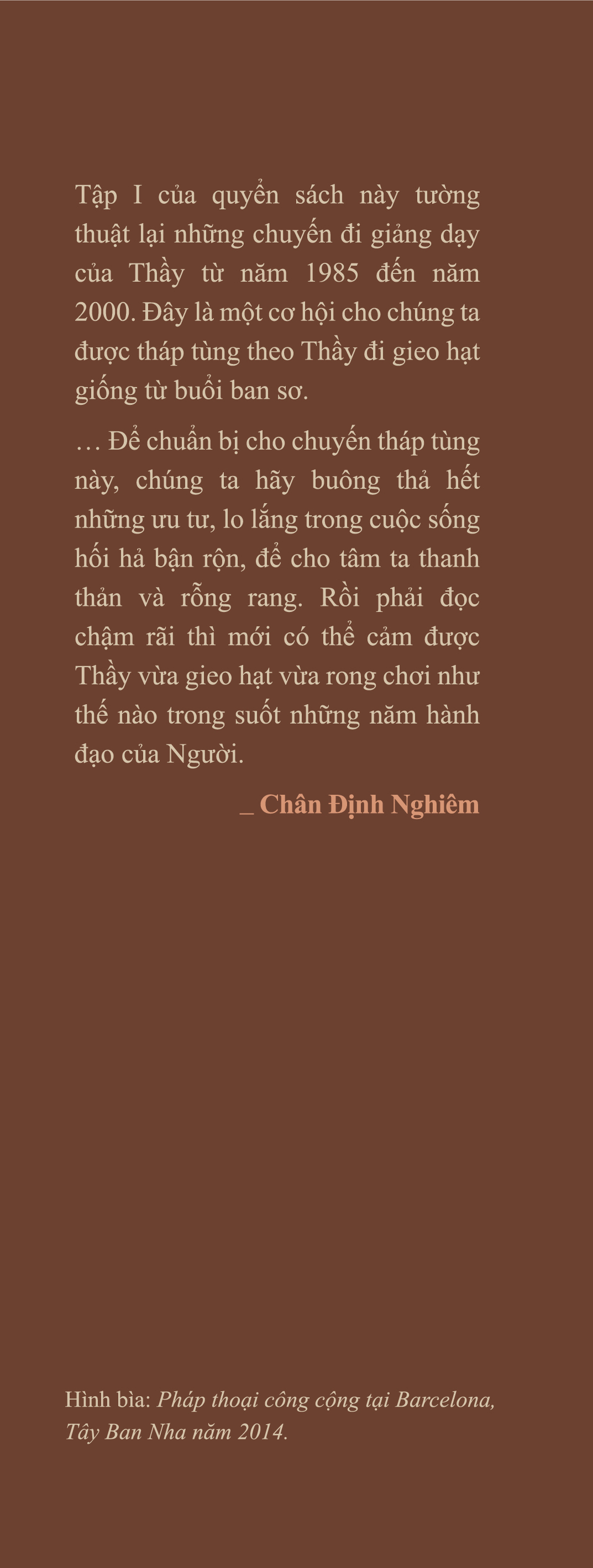 THÔNG TIN TÁC PHẨM Tập 1 của quyển sách này tường thuật lại những chuyến đi giảng dạy của Thầy từ năm 1985 đến năm 2000. Đây là một cơ hội cho chúng ta được tháp tùng theo Thầy đi gieo hạt giống từ buổi ban sơ.