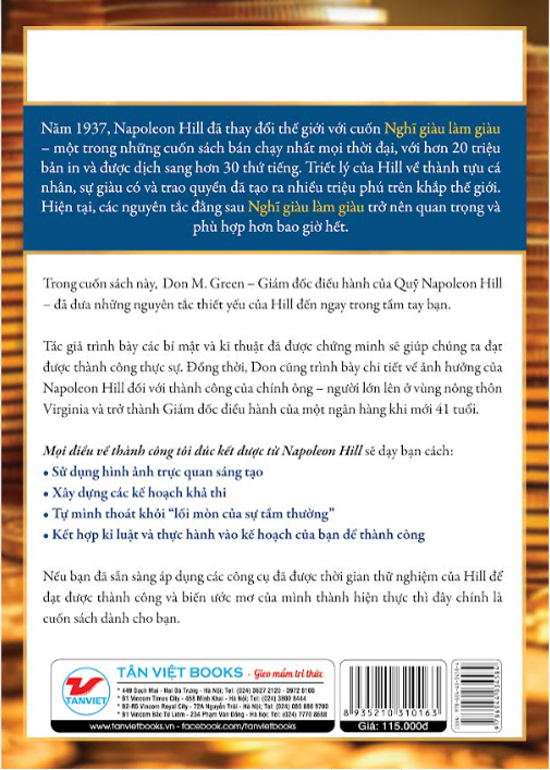Năm 1937, Napoleon Hill đã thay đổi thế giới với cuốn Nghĩ giàu làm giàu – một trong những cuốn sách bán chạy nhất mọi thời đại, với hơn 20 triệu bản in và được dịch sang hơn 30 thứ tiếng. Triết lý của Hill về thành tựu cá nhân, sự giàu có và trao quyền đã tạo ra nhiều triệu phú trên khắp thế giới. Hiện tại, các nguyên tắc đằng sau Nghĩ giàu làm giàu trở nên quan trọng và phù hợp hơn bao giờ hết. Trong cuốn sách mới này - Mọi điều về thành công tôi đúc kết được từ Napoleon Hill - Don M. Green, Giám đốc điều hành của Quỹ Napoleon Hill, đã đưa những nguyên tắc thiết yếu của Hill đến ngay trong tầm tay bạn. Tác giả trình bày các bí mật và kĩ thuật đã được chứng minh sẽ giúp chúng ta đạt được thành công thực sự. Đồng thời, Don cũng trình bày chi tiết về ảnh hưởng của Napoleon Hill đối với thành công của chính ông - người lớn lên ở vùng nông thôn Virginia và trở thành Giám đốc điều hành của một ngân hàng khi mới 41 tuổi. Mọi điều về thành công tôi đúc kết được từ Napoleon Hill sẽ dạy bạn cách: Sử dụng hình ảnh trực quan sáng tạo Xây dựng các kế hoạch khả thi Tự mình thoát khỏi “lối mòn của sự tầm thường” Kết hợp kỉ luật và thực hành vào kế hoạch của bạn để thành công Nếu bạn đã sẵn sàng áp dụng các công cụ đã được thời gian thử nghiệm của Hill để đạt được thành công và biến ước mơ của mình thành hiện thực thì đây chính là cuốn sách dành cho bạn.