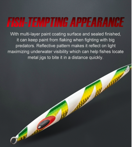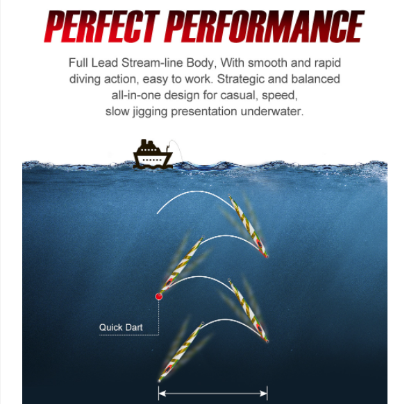 Thiết kế con mồi độc đáo giúp nó nhanh chống chìm xuống đáy biển, màu sắc tinh tế được sơn tĩnh điện bên trong phù hợp với môi trường nước mặn, bên màu theo thời gian. Chất liệu carbon cao cấp nó như một tuyệt tác nghệ thuật tạo action tốt giúp thu hút các loại cá cả tầng đáy và tầng lững,...