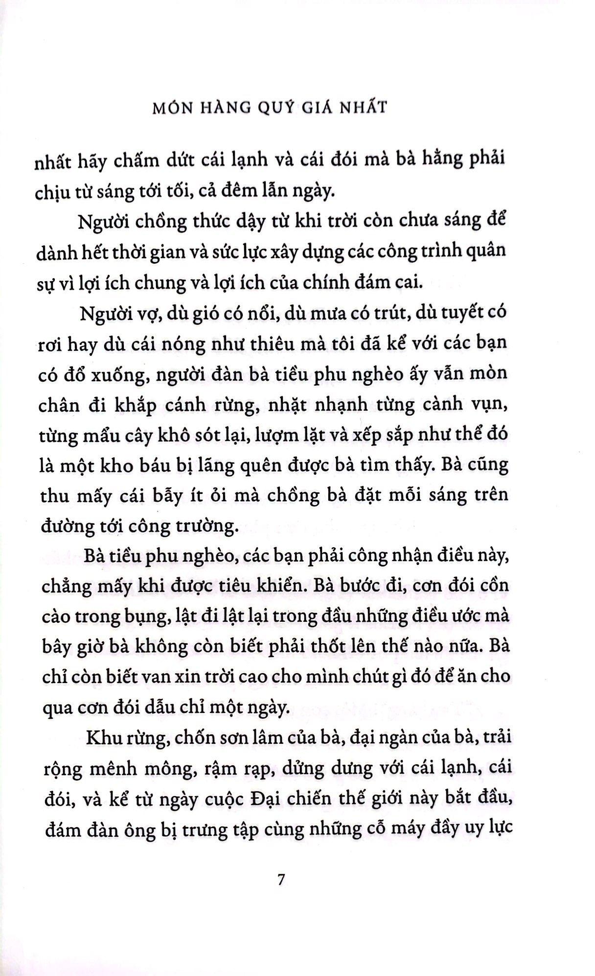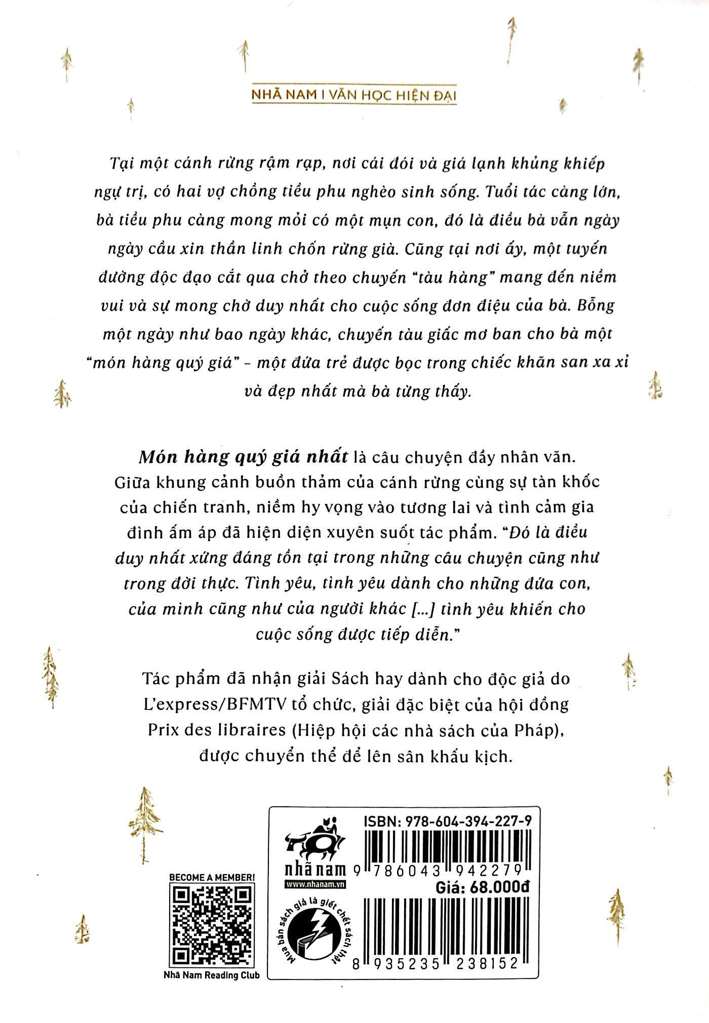 Món hàng quý giá nhất là câu chuyện đầy nhân văn. Giữa khung cảnh buồn thảm của cánh rừng cùng sự tàn khốc của chiến tranh, niềm hy vọng vào tương lai và tình cảm gia đình ấm áp đã hiện diện xuyên suốt tác phẩm. “Đó là điều duy nhất xứng đáng tồn tại trong những câu chuyện cũng như trong đời thực. Tình yêu, tình yêu dành cho những đứa con, của m.ình cũng như của người khác [] tình yêu khiến cho cuộc sống được tiếp diễn.”