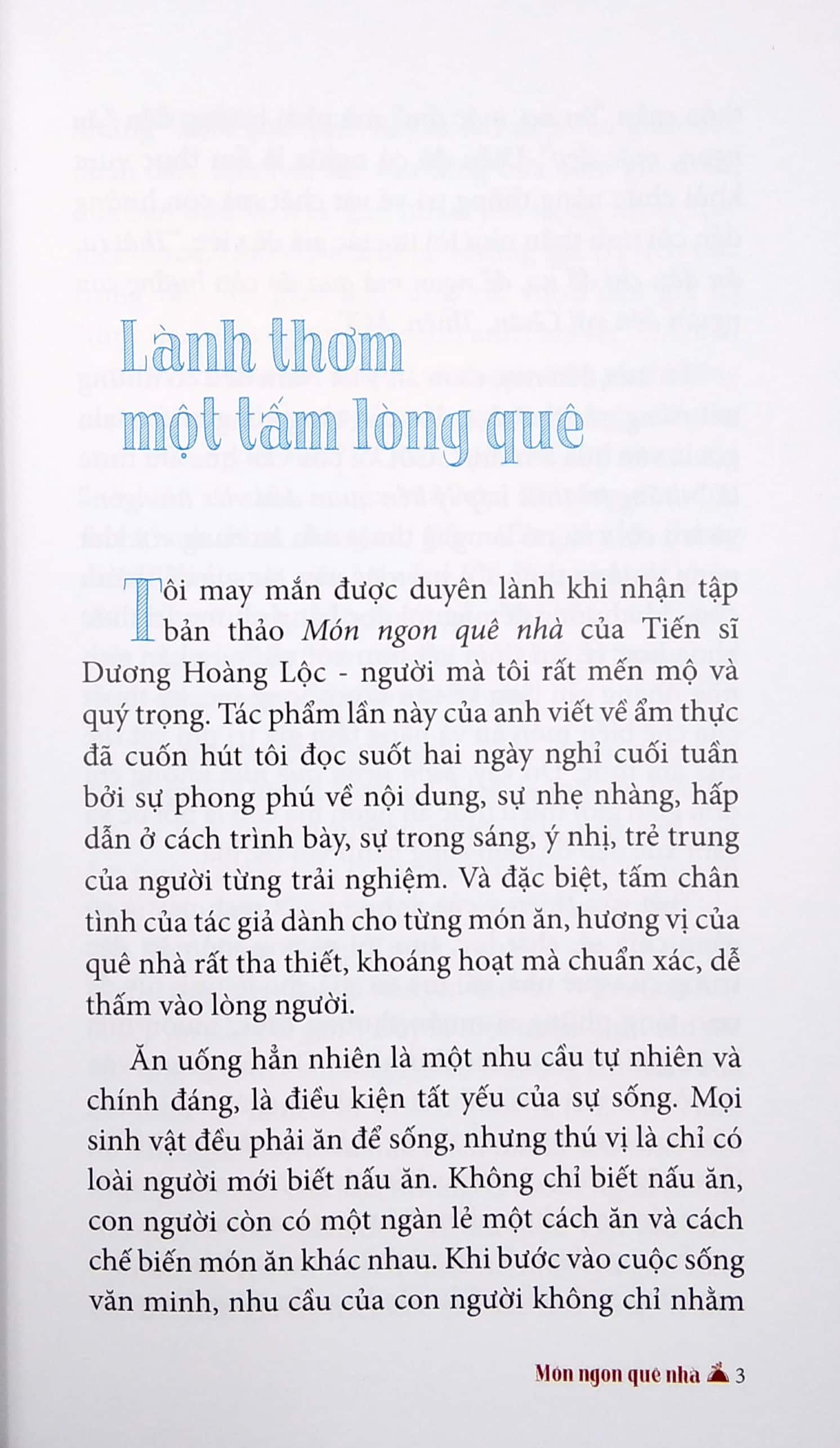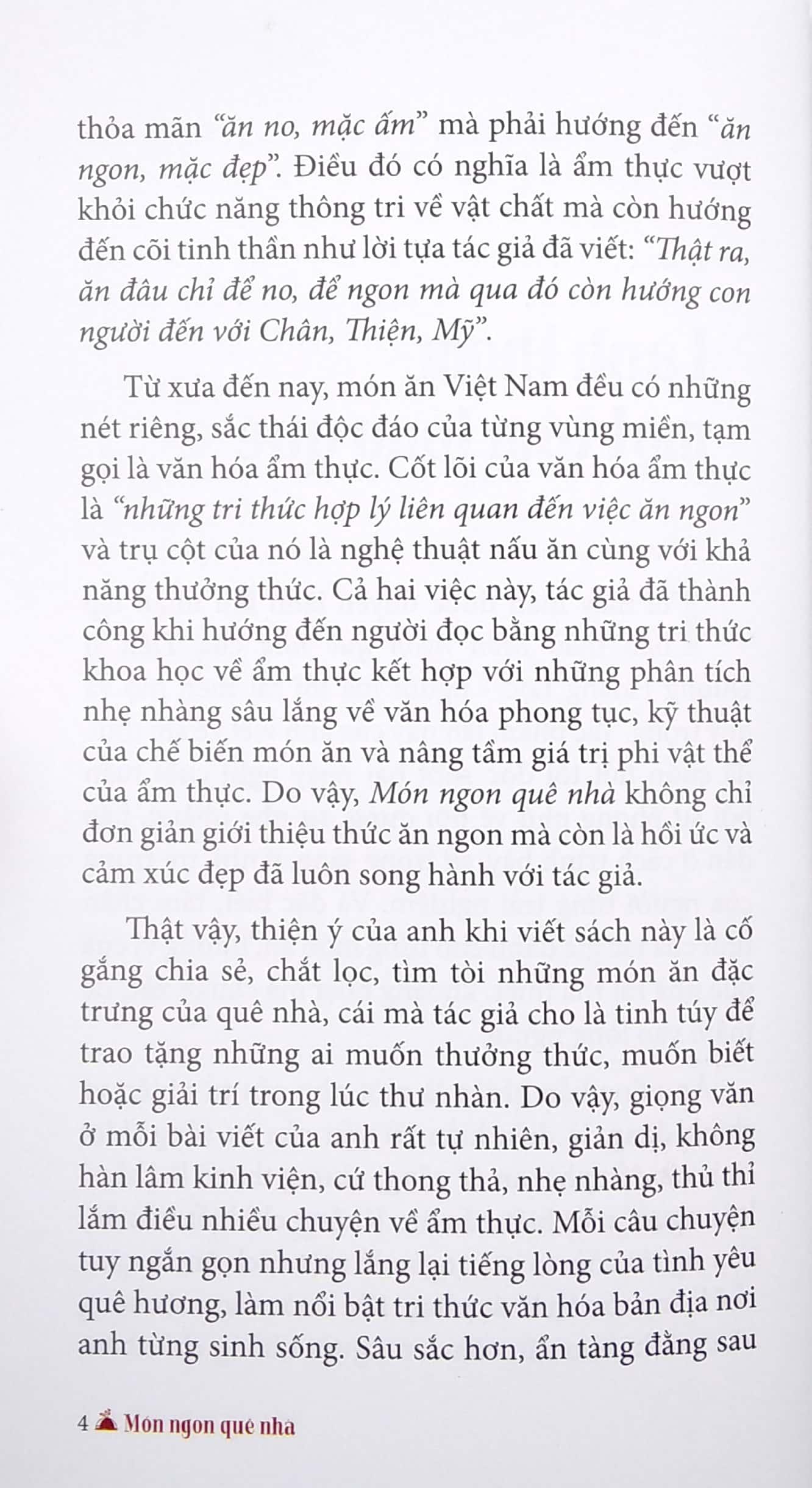 Mua tại TiktokTừ xưa tới nay, món ăn Việt Nam đều có những nét riêng, sắc thái độc đáo từng vùng miền, tạm gọi là văn hóa ẩm thực. Cốt lõi của văn hóa ẩm thực là “những tri thức hợp lý liên quan đến việc ăn ngon” và trụ cột của nó là nghệ thuật nấu ăn cùng với khả năng thưởng thức. Cả hai việc này, tác giả đã thành công khi hướng đến người đọc bằng những tri thức khoa học về ẩm thực kết hợp với những phân tích nhẹ nhàng sâu lắng về phong tục, kỹ thuật của chế biến món ăn và nâng tầm giá trị phi vật thể của ẩm thực. Do vậy, Món ngon quê nhà không chỉ đơn giản giới thiệu thức ăn ngon mà còn là hồi ức và cảm xúc đẹp đã luôn song hành với tác giả .