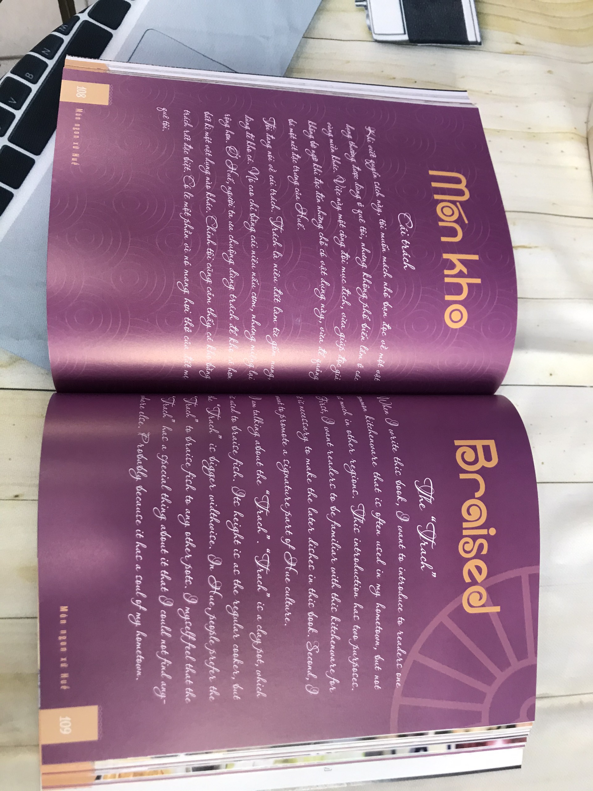 Bên cạnh những công thức món ăn, tác giả cũng trò chuyện với độc giả bằng những câu chuyện nhỏ nhẹ, thủ thỉ tâm tình theo cách rất… Huế. “Tôi sẽ kể bạn nghe, một câu chuyện nhỏ, chuyện về ẩm thực xứ Huế, về những món ăn dân dã đời thường và có cả sơn hào hải vị. Những món ăn đã đi vào lòng người, vượt ra ngoài đất Huế đến khắp mọi miền quê hương… Tôi sinh ra ở Huế, nhà gần khu Cầu Đông Ba. Trong kí ức của tôi khi còn là cô bé ngày xưa, có một Huế rất đẹp và nên thơ, một Huế nhớ Huế thương, một Huế bạt ngàn mộng tưởng, một Huế tuy không ồn ào tàu xe nhưng lại sầm uất hàng quán với nhiều món ăn nức lòng thực khách…” Cứ thế, tác giả thì thầm cùng độc giả những ký ức, những hương vị xưa cũ mà sắc hương còn lan tỏa đến tận hôm nay.