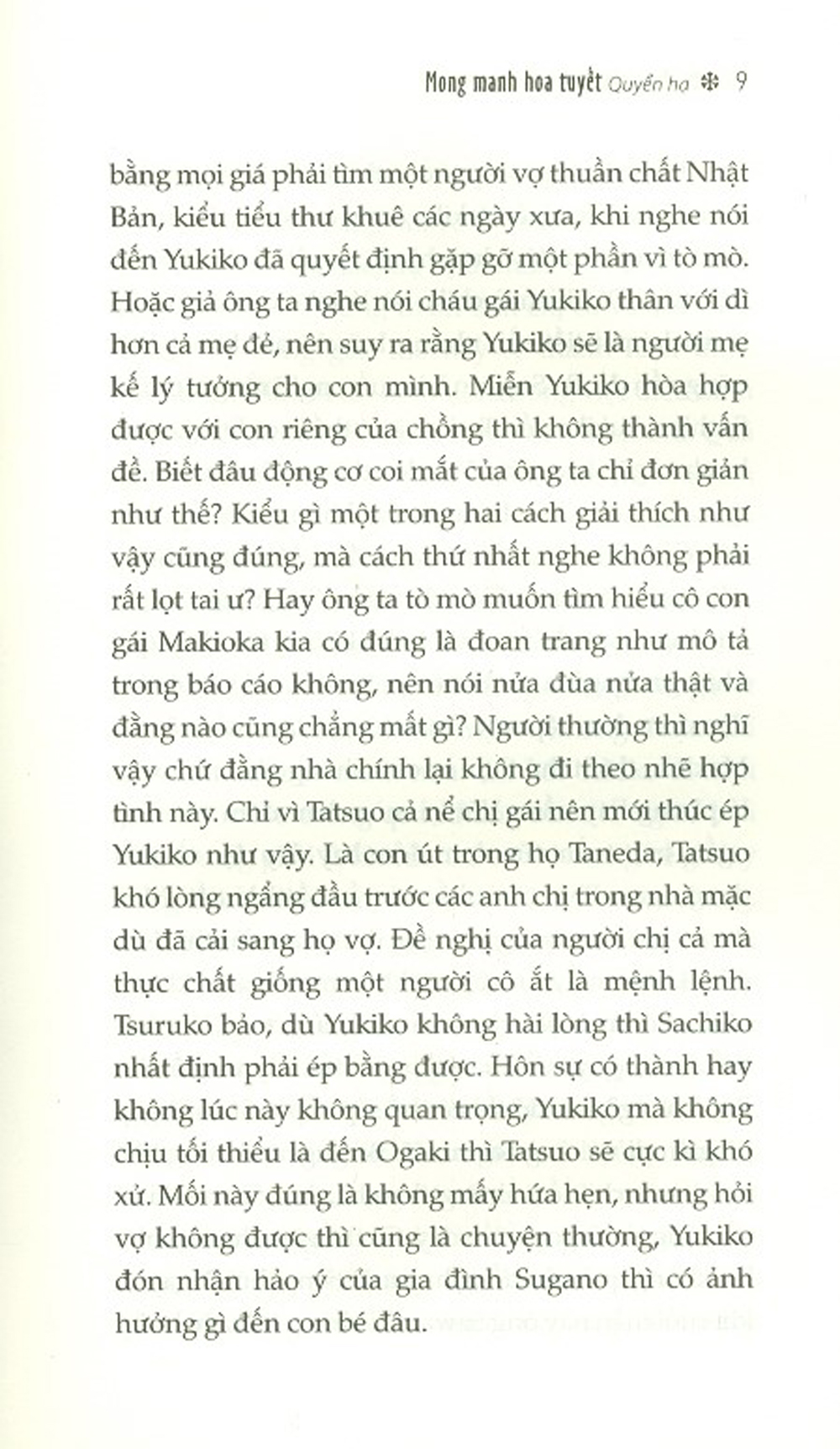 Trong hơi nóng của Thế chiến II, những nỗ lực níu kéo nếp sống phù hoa thơ mộng của chị em nhà Makioka, hậu duệ của một danh gia bên bờ tàn lụi, bỗng trở nên mong manh như hoa tuyế Tao ngộ của họ tiêu biểu cho những xung đột thế hệ điển hình của xã hội Á Đông, và đặc biệt là cho thân phận người phụ nữ ở thời điểm chuyển giao lịch sử. Bốn cô gái nhà Makioka một mặt đều là sản phẩm trực tiếp của thời đại, mặt khác vẫn là bốn cá tính hấp dẫn và khác biệt trong cách mỗi người đương đầu với những đổi thay của thời cuộc. Yếu đuối nhưng cũng rất kiên cường trước mọi phũ phàng của bi kịch gia đình và của cuộc loạn ly sắp sửa, họ vẫn xứng đáng là sứ giả của cái đẹp, dẫu chỉ là chút dư quang sót lại của ngày tàn.