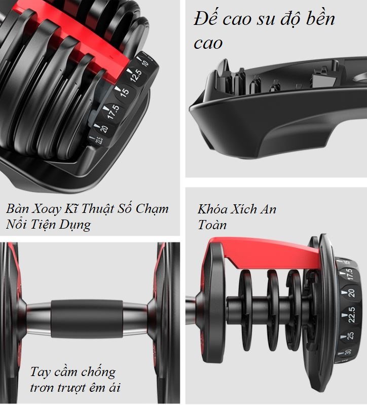 Thông tin tạ tay điều chỉnh 20 Kg - Tạ tay điều chình 20 Kg được thiết kế chắc chắn, với tính thẩm mỹ cao. Có kèm đế đỡ tiện lợi, tránh gây trầy xước cho tạ.