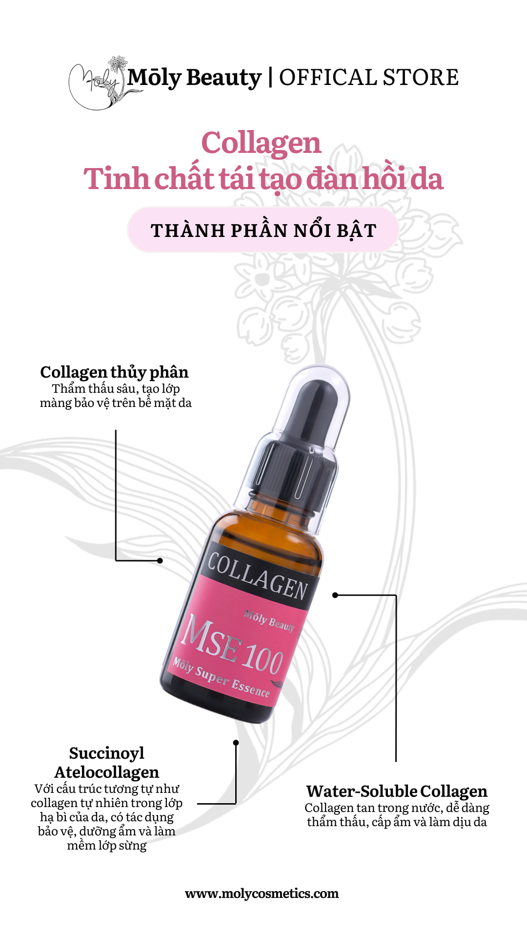 MÔ TẢ: MSE100 Super Essence CO - Tinh chất tái tạo đàn hồi da Collagen 30ml - Mōly Beauty Thương hiệu: Mōly Beauty Quy cách: 30ml Xuất xứ: Nhật Bản  Thời hạn sử dụng: 3 năm Bảo quản: Để nơi thoáng mát Thích hợp: Dùng cho mọi loại da   CÔNG DỤNG: Với sự kết hợp của 3 loại tinh chất Collagen tiên tiến, sản phẩm chăm sóc da này là lựa chọn lý tưởng cho phụ nữ khi da bắt đầu có dấu hiệu mất độ đàn hồi và căng bóng. Độ ẩm được thẩm thấu sâu vào các tầng da, giúp tái tạo làn da săn chắc và đàn hồi. Đặc biệt, Collagen thuỷ phân với phân tử thấp giúp ngăn ngừa quá trình xuất hiện nếp nhăn và giữ cho làn da luôn mềm mại.   THÀNH PHẦN: Collagen thủy phân (hay còn gọi là collagen ở dạng phân tử thấp): thẩm thấu vào các ngóc ngách của lớp sừng dưới da, tạo lớp màng bảo vệ trên bề mặt da Succinoyl Atelocollagen là Collagen hòa tan trong nước được xử lý đặc biệt để các collagens không bị vón cục lại với nhau. Nó cũng giống như collagen tồn tại trong lớp hạ bì, có tác dụng bảo vệ, dưỡng ẩm và làm mềm chất sừng tuyệt vời Water-Soluble Collagen: Collagen tan trong nước, có khả năng giúp cung cấp độ ẩm và làm dịu da.
