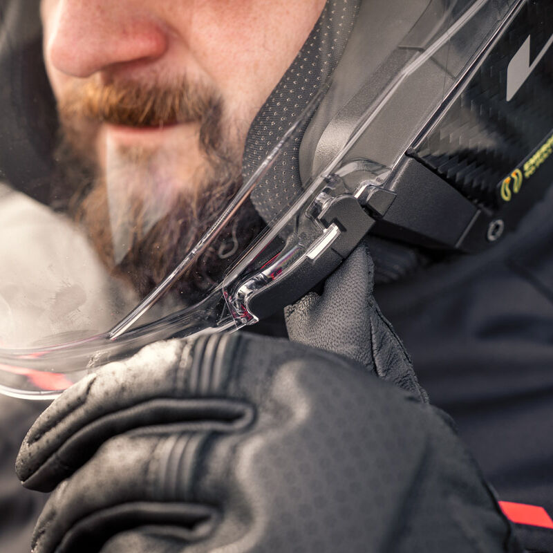 Để tăng thêm mức độ an toàn, mũ LS2 OF603 Carbon còn được trang bị thêm hệ thống tháo lót khẩn cấp. Bộ phận này có tác dụng giúp người đội/ người cứu hộ dễ dàng tháo ốp đệm má nhanh chóng trong trường hợp không may xảy ra tai nạn, tăng thêm không gian để tháo mũ bảo hiểm ra khỏi đầu người ngã với thao tác đơn giản nhất. Khi tháo lót khẩn cấp, hãy giữ mũ cố định tránh xê dịch để giảm thiểu tổn thương cho người đội. Sau đó, đưa đầu ngón tay luồn vào vòng tròn màu đỏ và kéo một cách cẩn thận để tháo các miếng lót mũ ra.