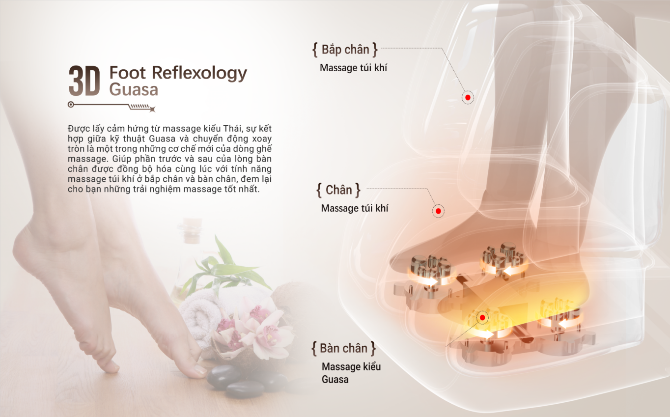 Công nghệ 3D Foot Rotaion Guasa - Massage 3D mô phỏng kiểu day ấn huyệt Guasa xoay vòng, chăm sóc “Trái tim thứ 2" của cơ thể bạn, thúc đẩy tuần hoàn máu một cách tối đa.