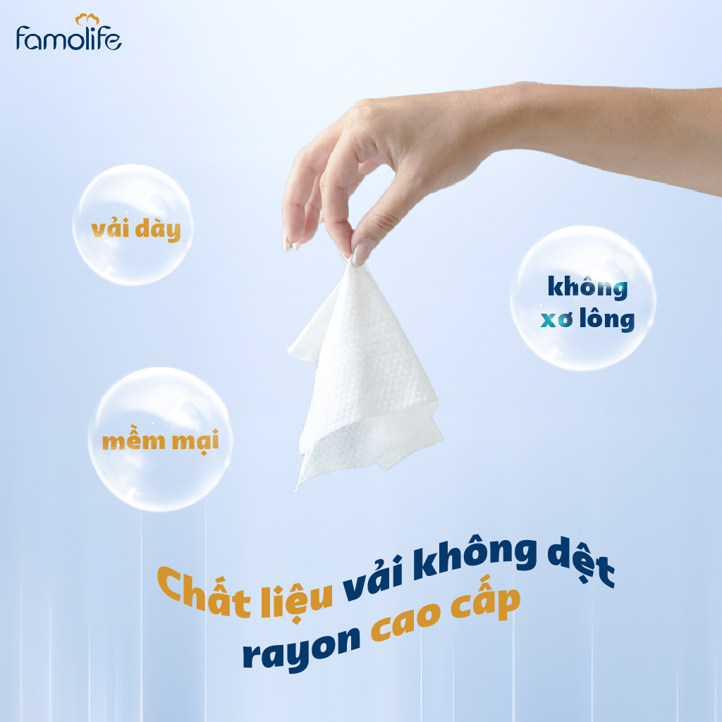 - Chất liệu vải không dệt rayon cao cấp, siêu mềm mại, không gây nhờn hay đổ lông trên da bé