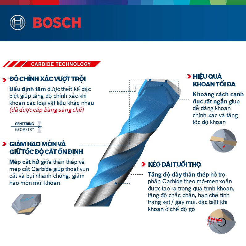 Ngoài ra, Bosch Hex-9 cũng được thiết kế với các rãnh xẻ sâu chống quặn mùn trong quá trình khoan. Điều này giúp mũi khoan di chuyển mượt mà trong lỗ khoan, ngăn chặn sự cản trở và tăng cường quá trình làm sạch. Điều này không chỉ giúp kéo dài tuổi thọ của mũi khoan mà còn đảm bảo một kết quả khoan chính xác và sạch sẽ.