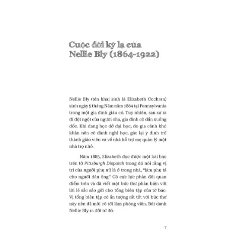 Kỳ thực, ban đầu chúng tôi chỉ định nói thật ngắn gọn về cuốn sách này, nhưng sau khi tìm hiểu kỹ hơn về Nellie Bly, chúng tôi cảm thấy nếu không giới thiệu về toàn bộ cuộc đời kỳ lạ của bà, dù sơ lược, thì thật đáng tiếc. Đối với chúng tôi, Nellie Bly là một người có tinh thần tiên phong và luôn luôn sống thật với những giá trị mà bà theo đuổi, và bà thể hiện điều đó trong từng hành động của mình, dù trong bất kỳ hoàn cảnh nào. Chính sức hấp dẫn lớn về nhân cách này đã khiến chúng tôi quyết định chọn đây là cuốn sách ra mắt của The Hitcher và cũng là cuốn mở đầu cho tủ sách Những kẻ Tiên phong của mình.